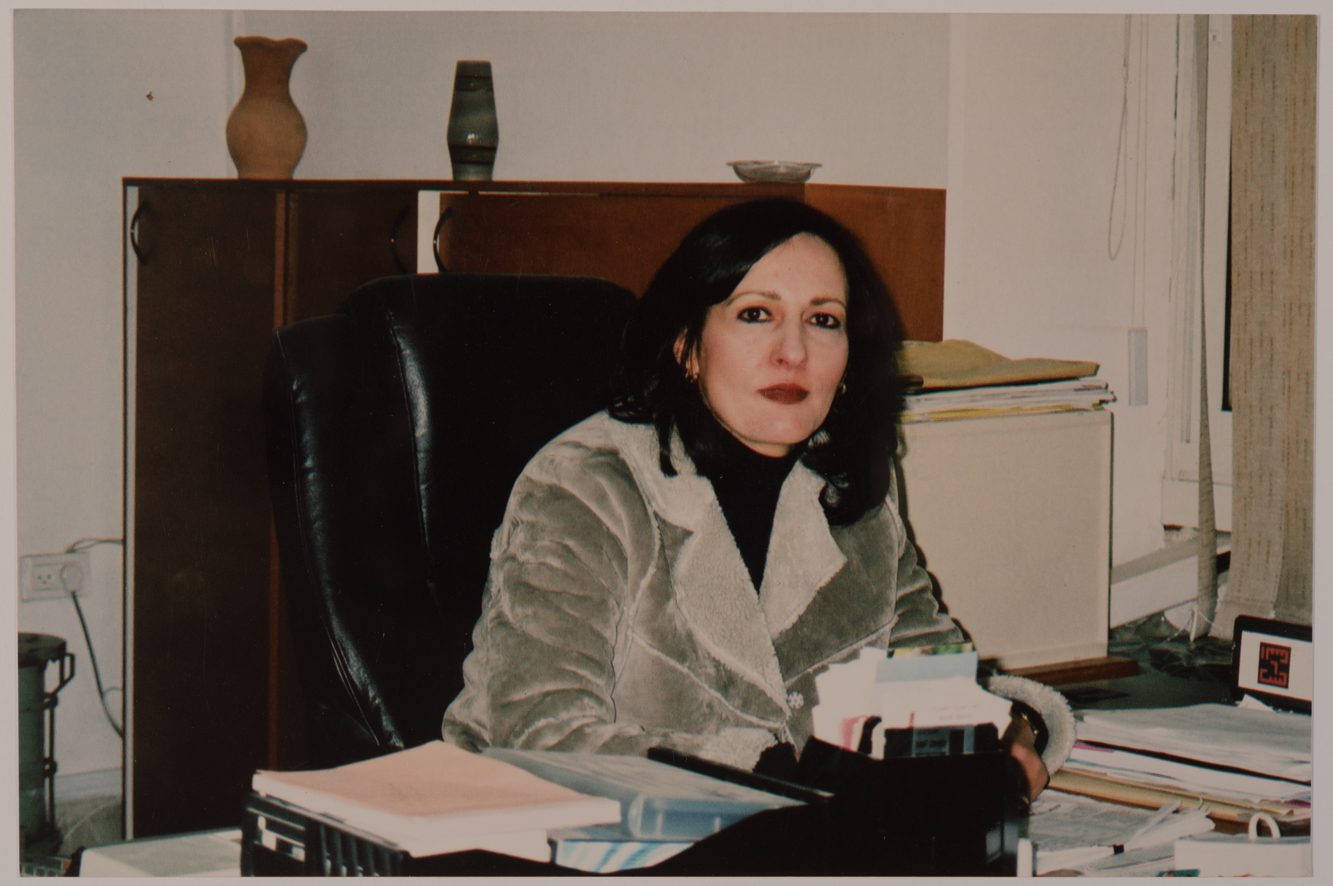 صورة ملونة يظهر فيها إحدى موظفات مدرسة الفرندز خلف مكتبها، وُجِدت الصورة في مجموعة مدرسة الفرندز.