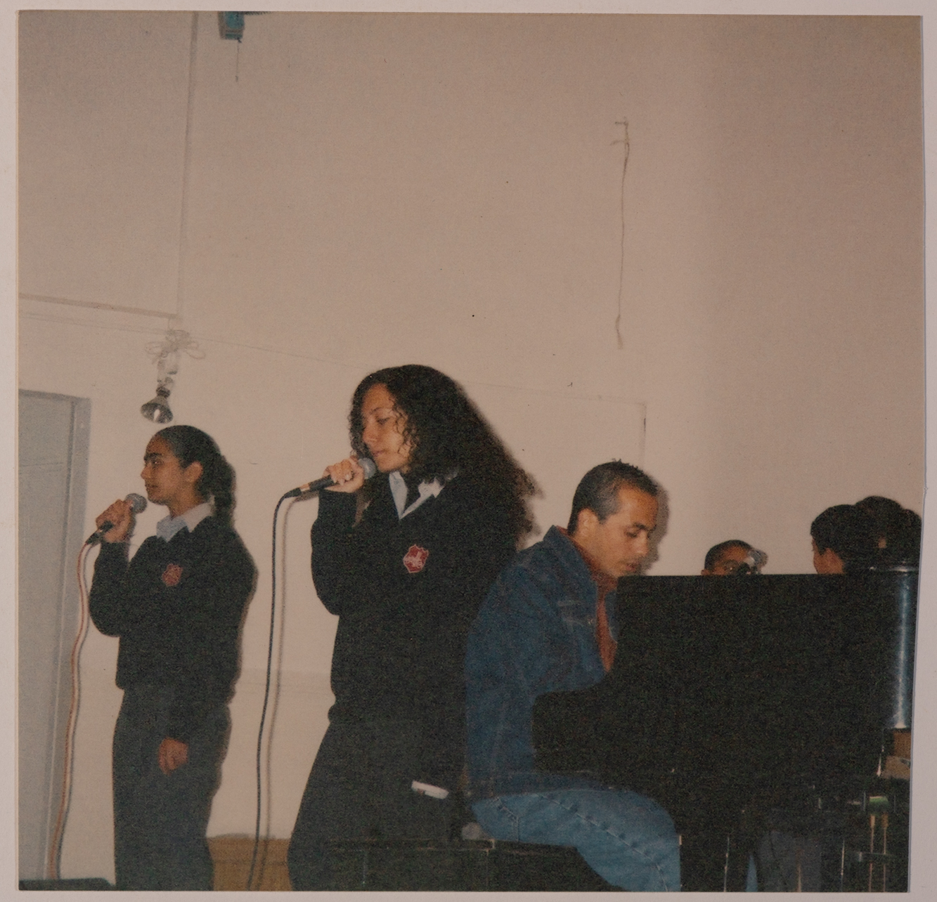 صورة ملونة يظهر فيها طالبتان من مدرسة الفرندز تغنيان ورجل يعزف على البيانو، وُجِدت الصورة في مجموعة مدرسة الفرندز.