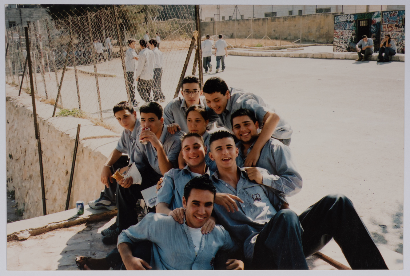 صورة ملونة يظهر فيها مجموعة من طلبة مدرسة الفرندز في ساحة المدرسة، وُجِدت الصورة في مجموعة مدرسة الفرندز.