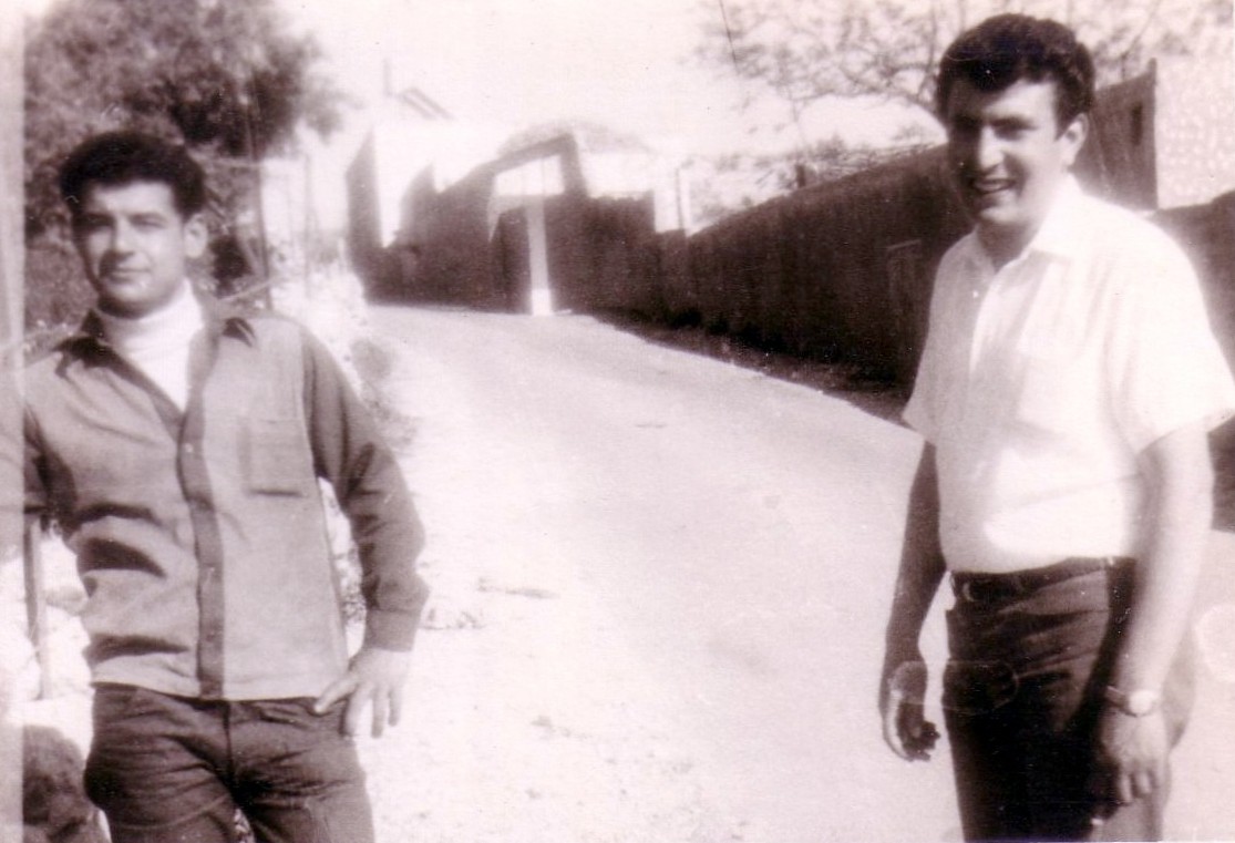 A black-and-white photograph showing two young men.