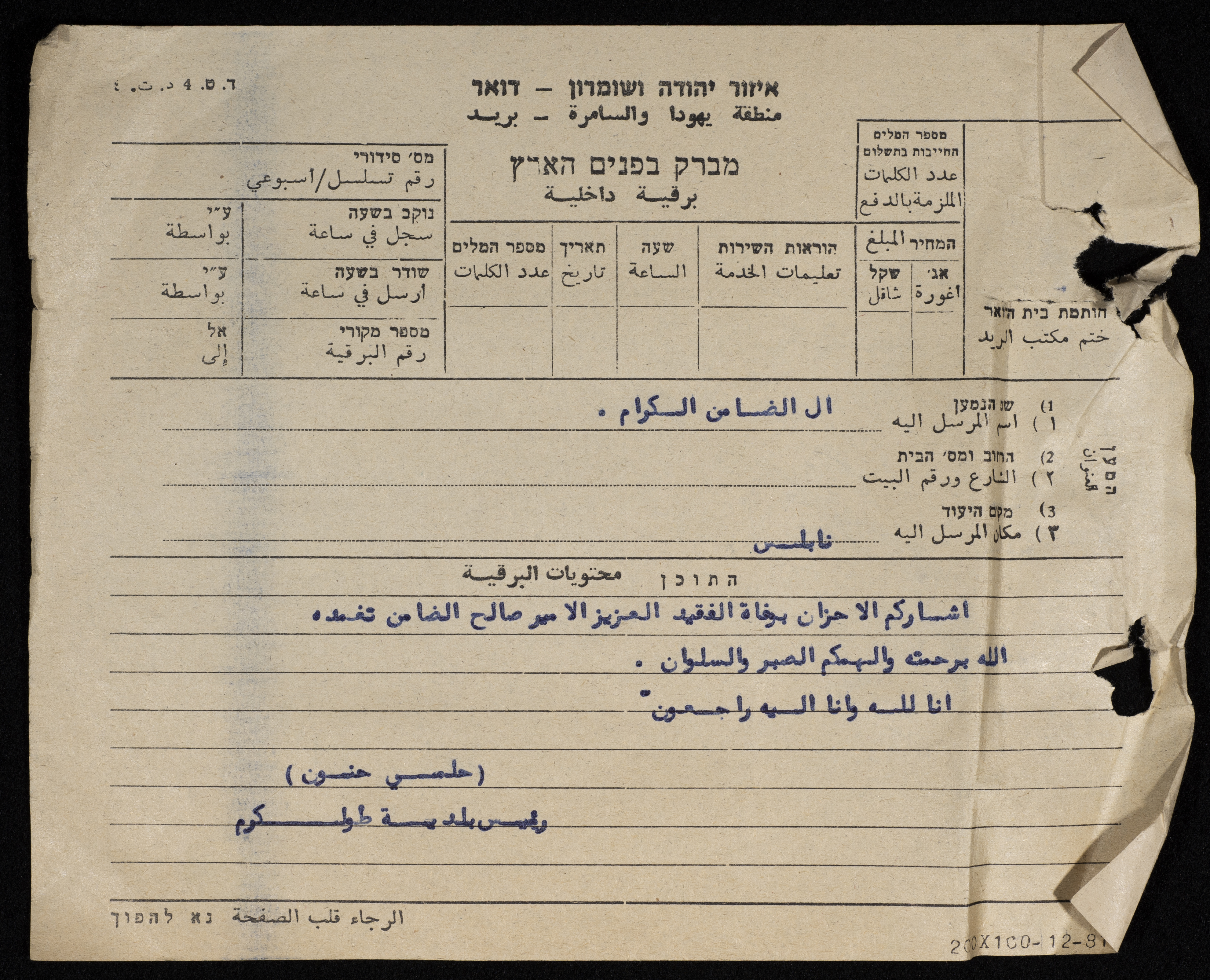 A Telegram from the Mayor of Tulkarem to al-Ḍamin Family