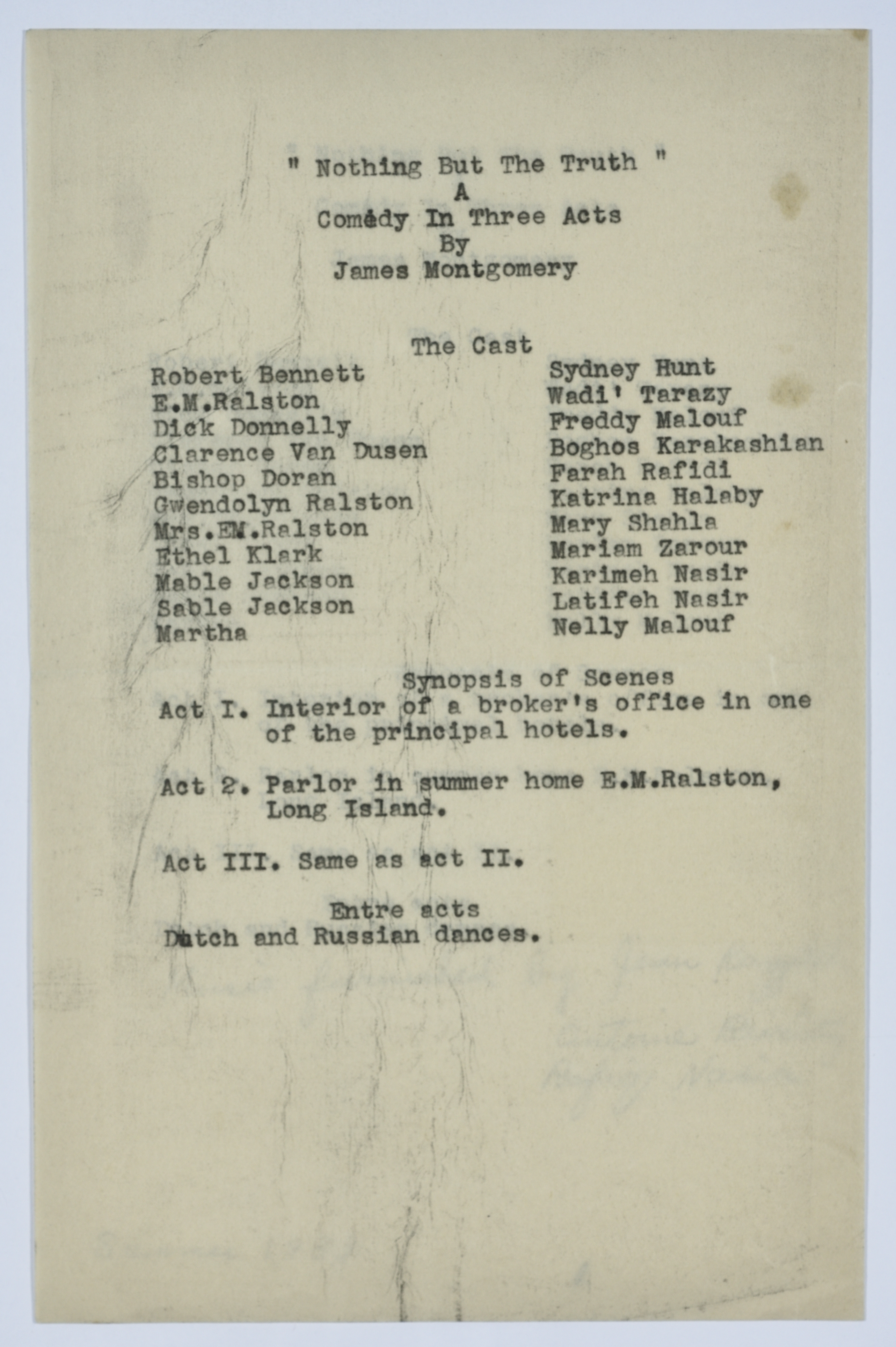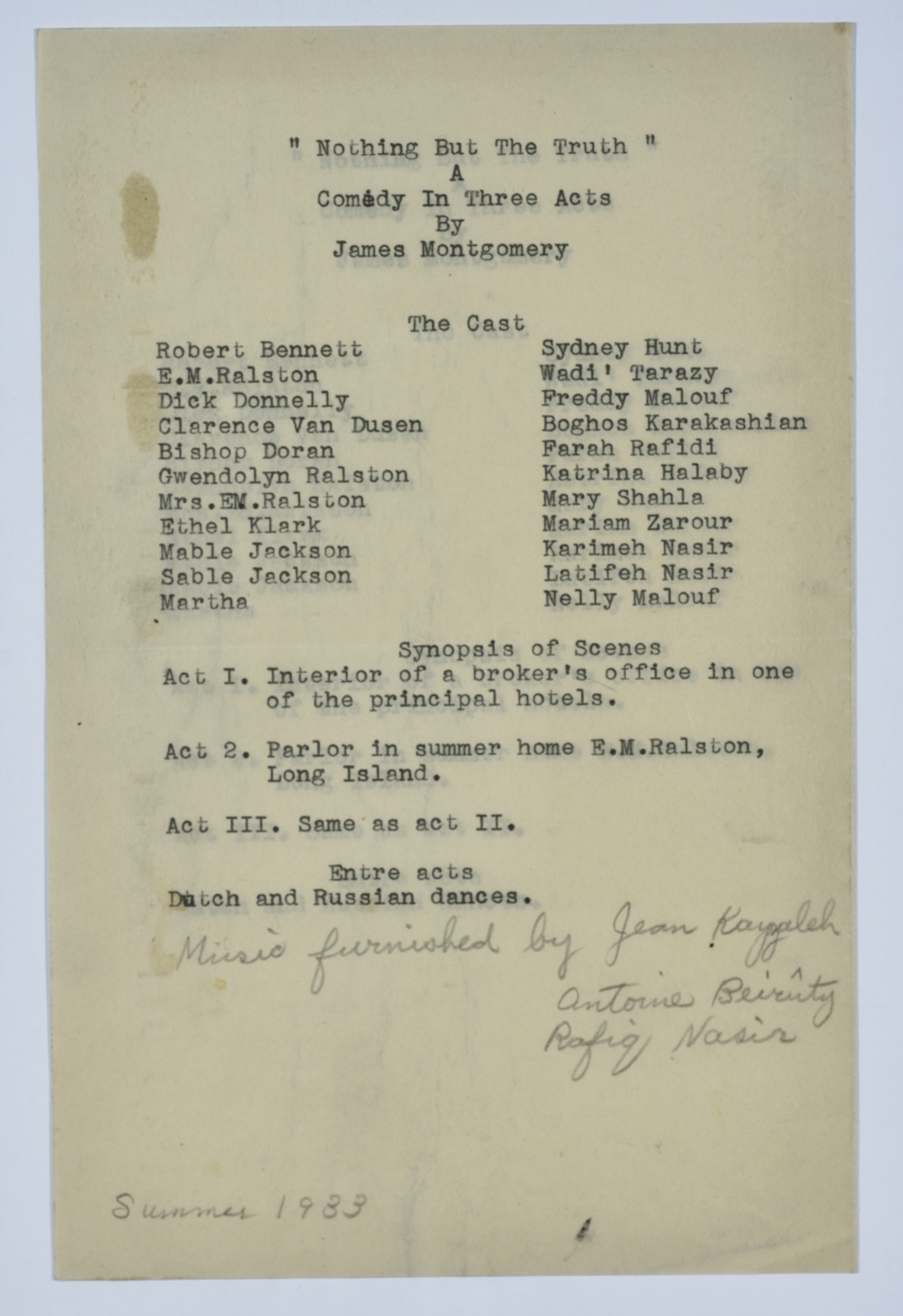 Nothing but the truth was presented in the summer of 1933 and the document refers to the names of actors and parts of the play to be represented