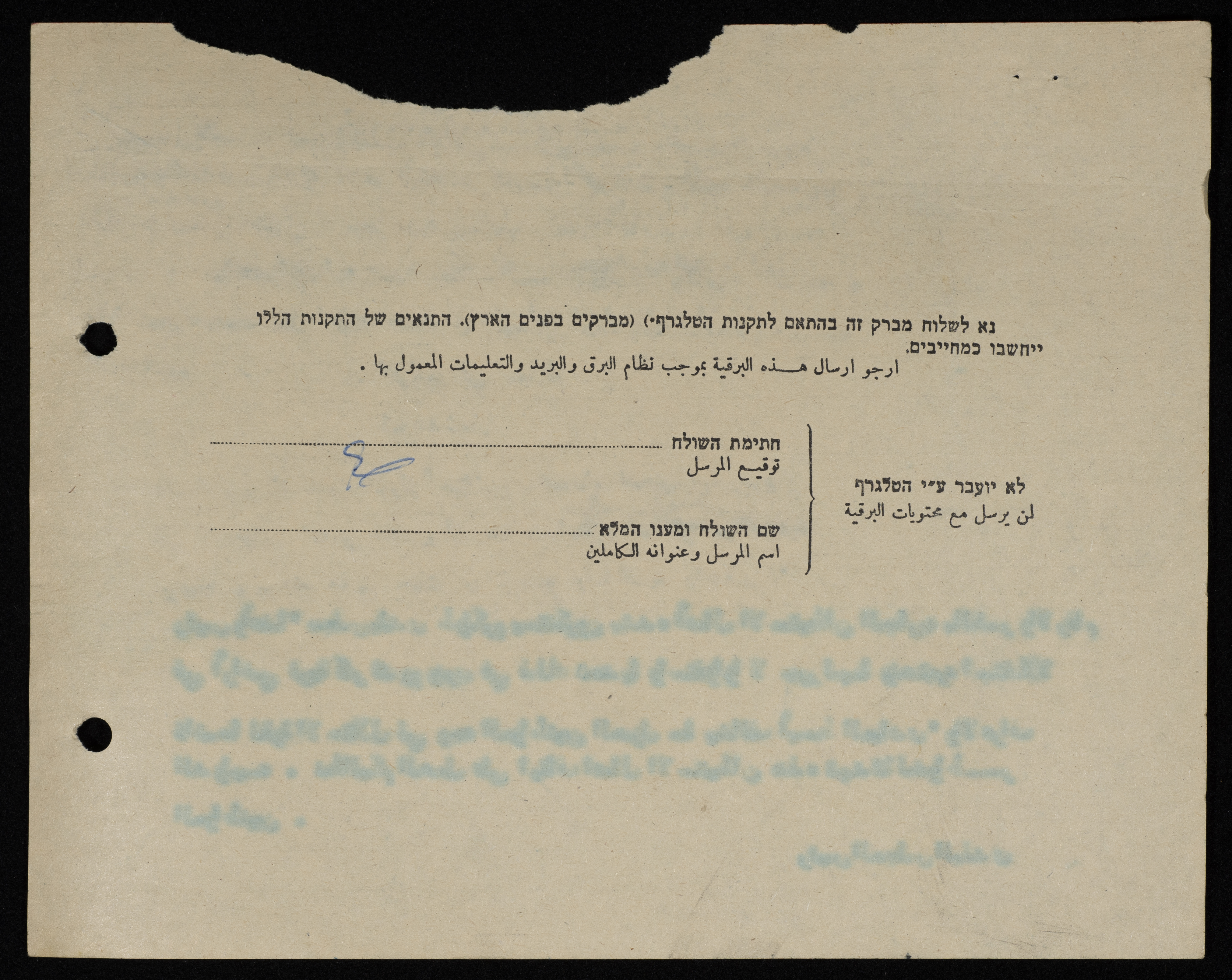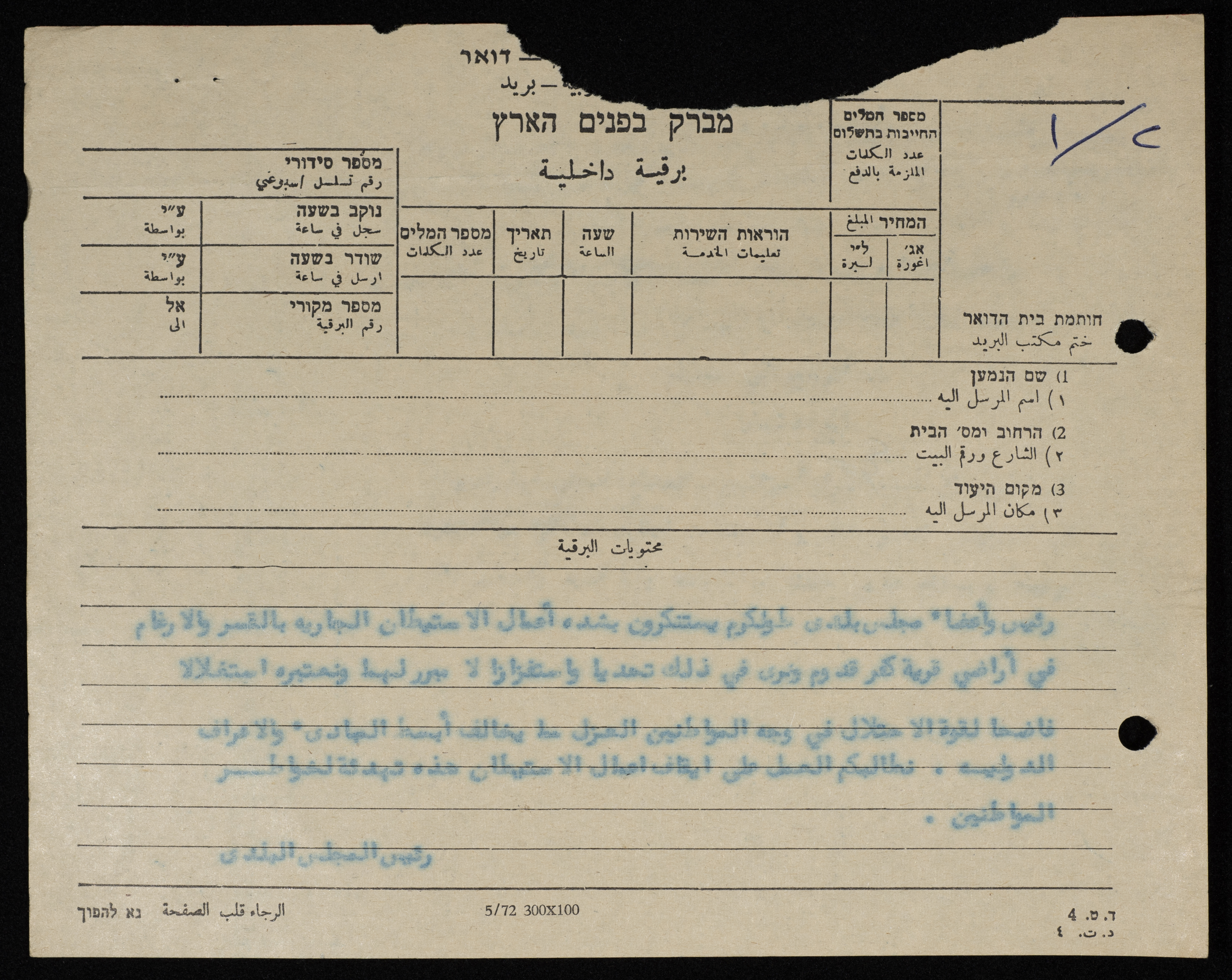 برقية مرسلة من رئيس بلدية طولكرم إلى سلطات الاحتلال الاسرئيلي