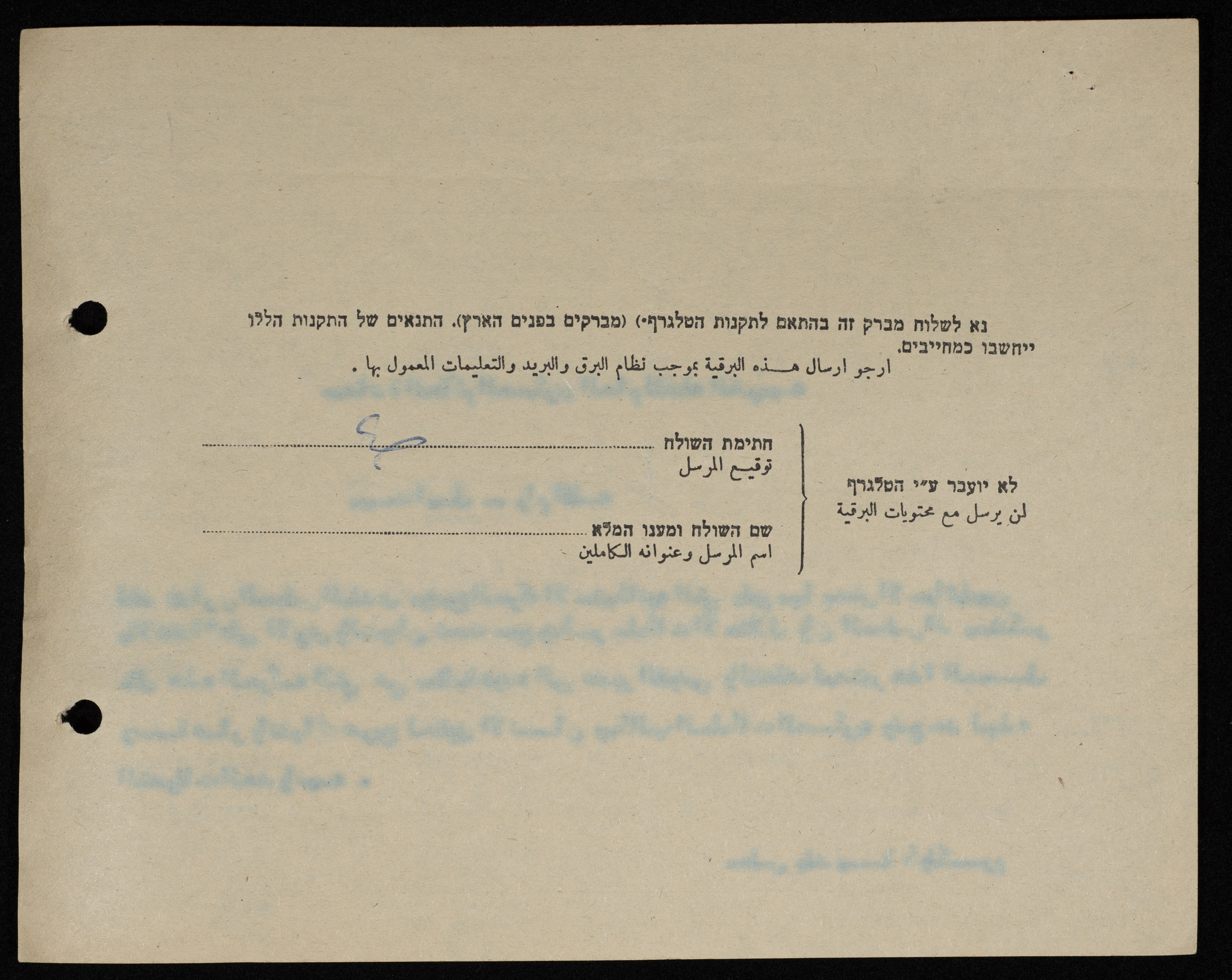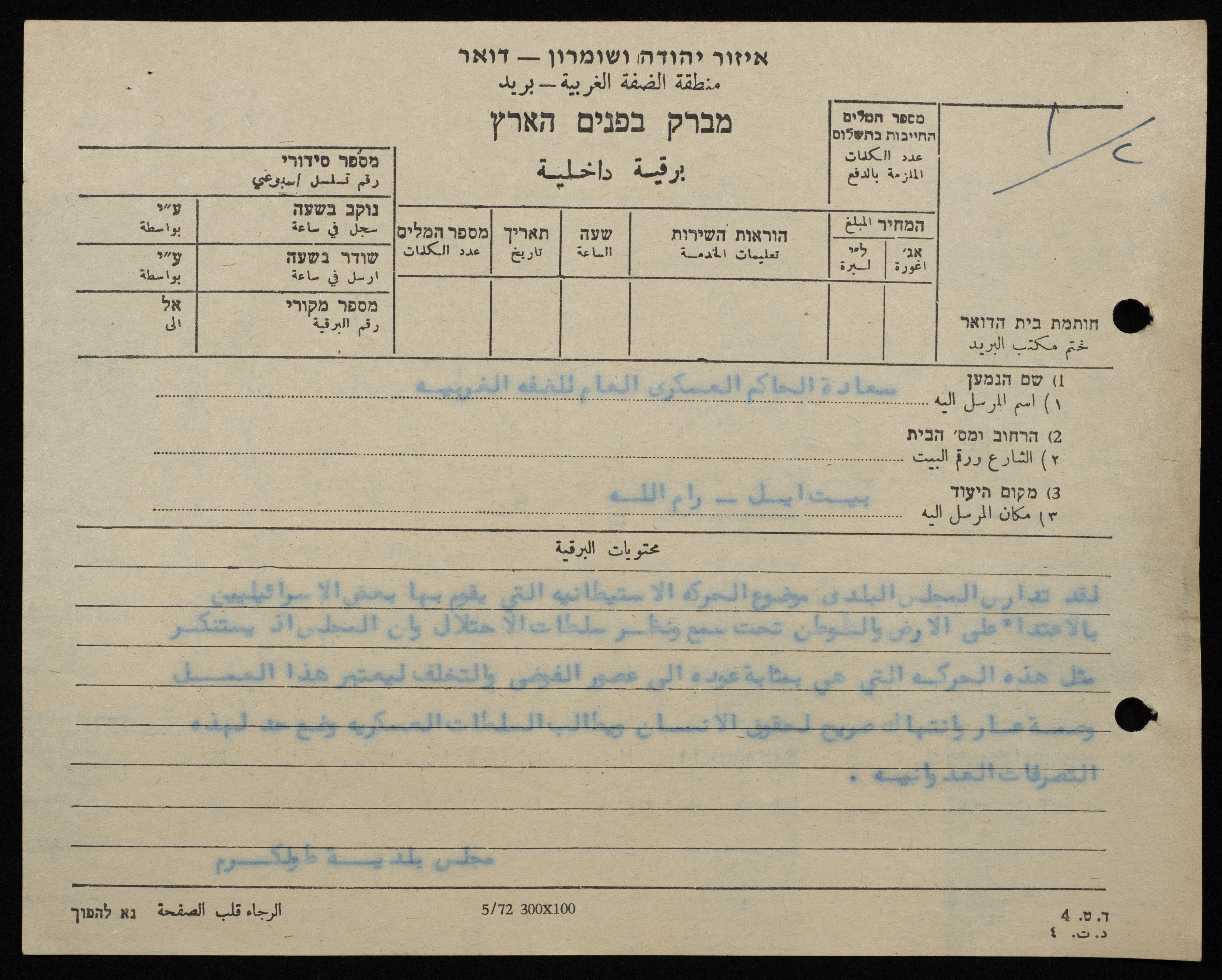 برقية مرسلة من رئيس بلدية طولكرم إلى الحاكم العسكري للضفة الغربية