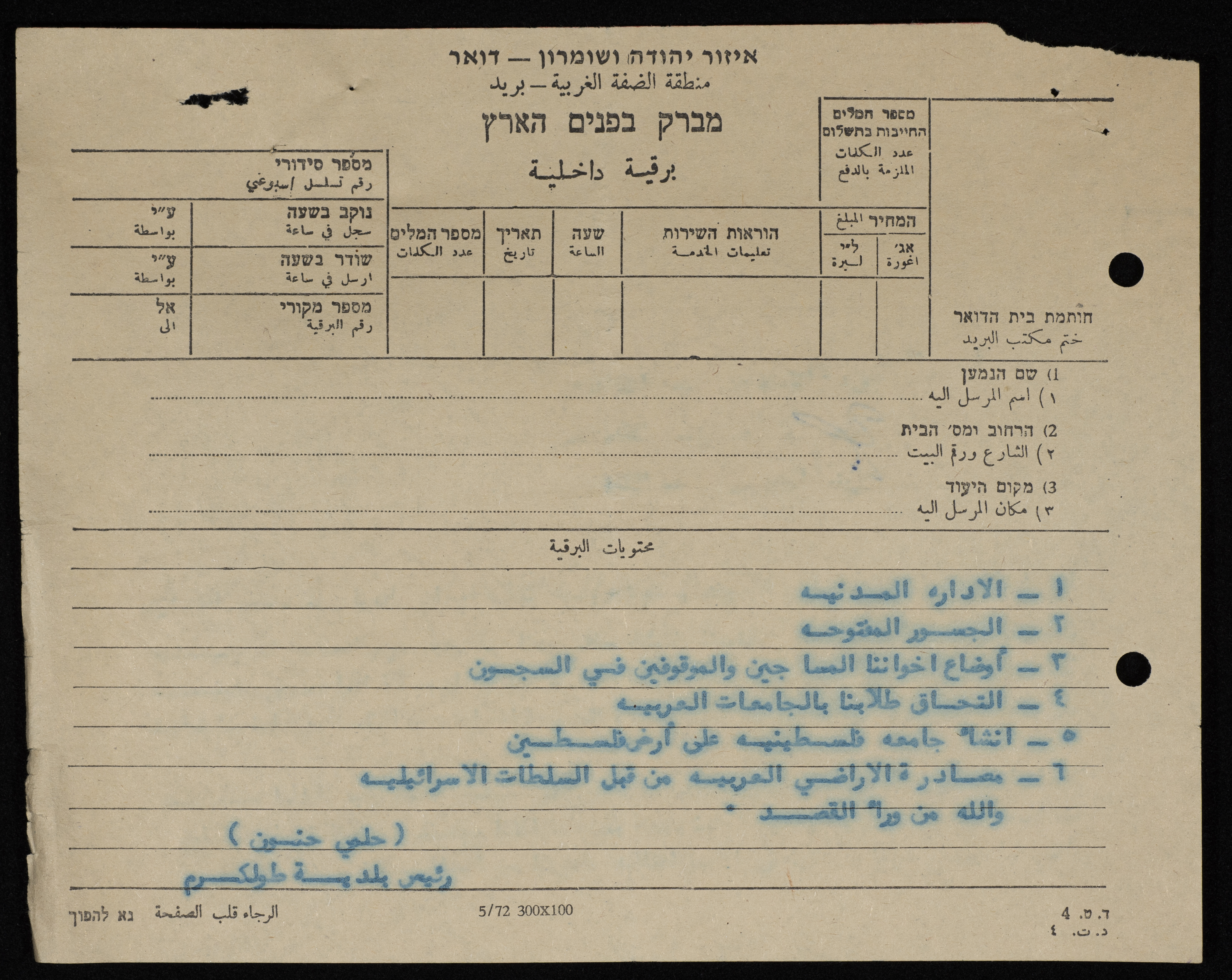 برقية مرسلة من رئيس بلدية طولكرم إلى الصحف الفلسطينية المحلية