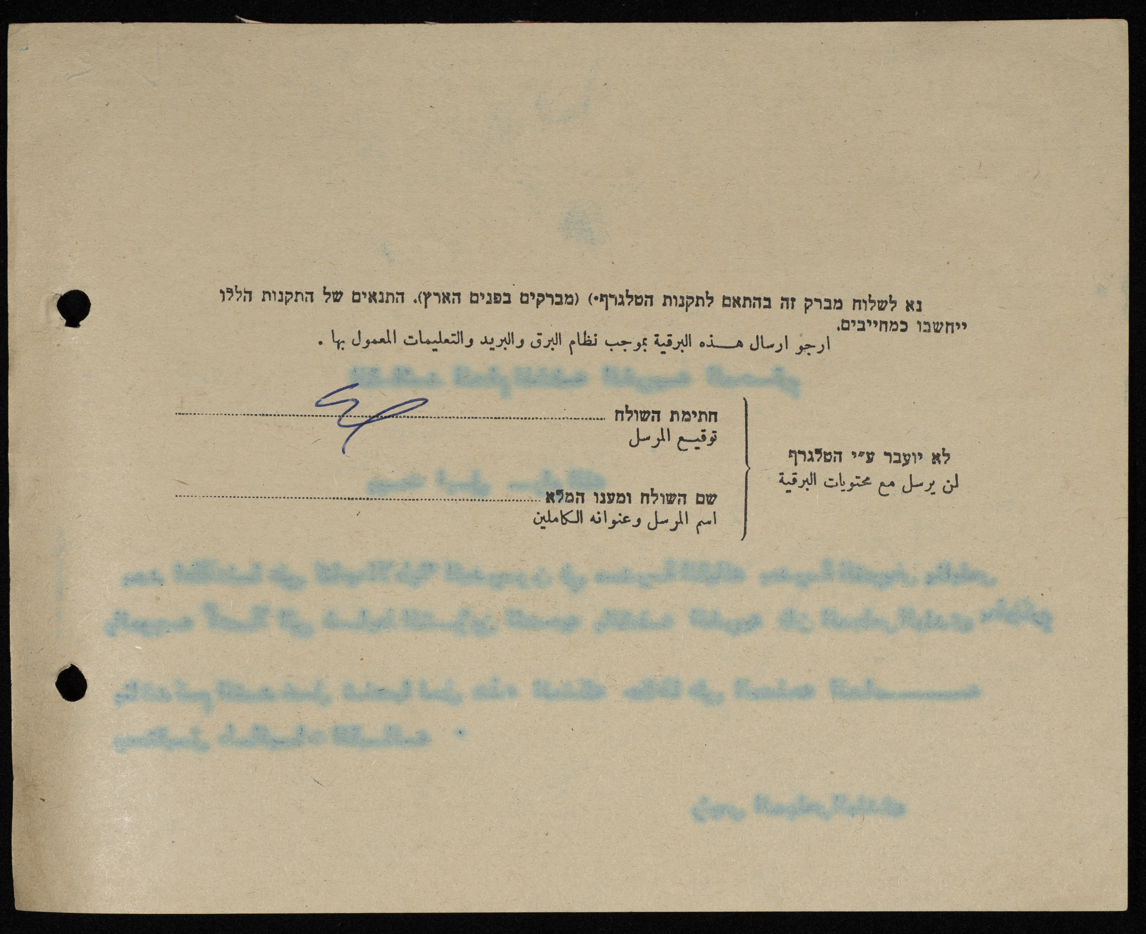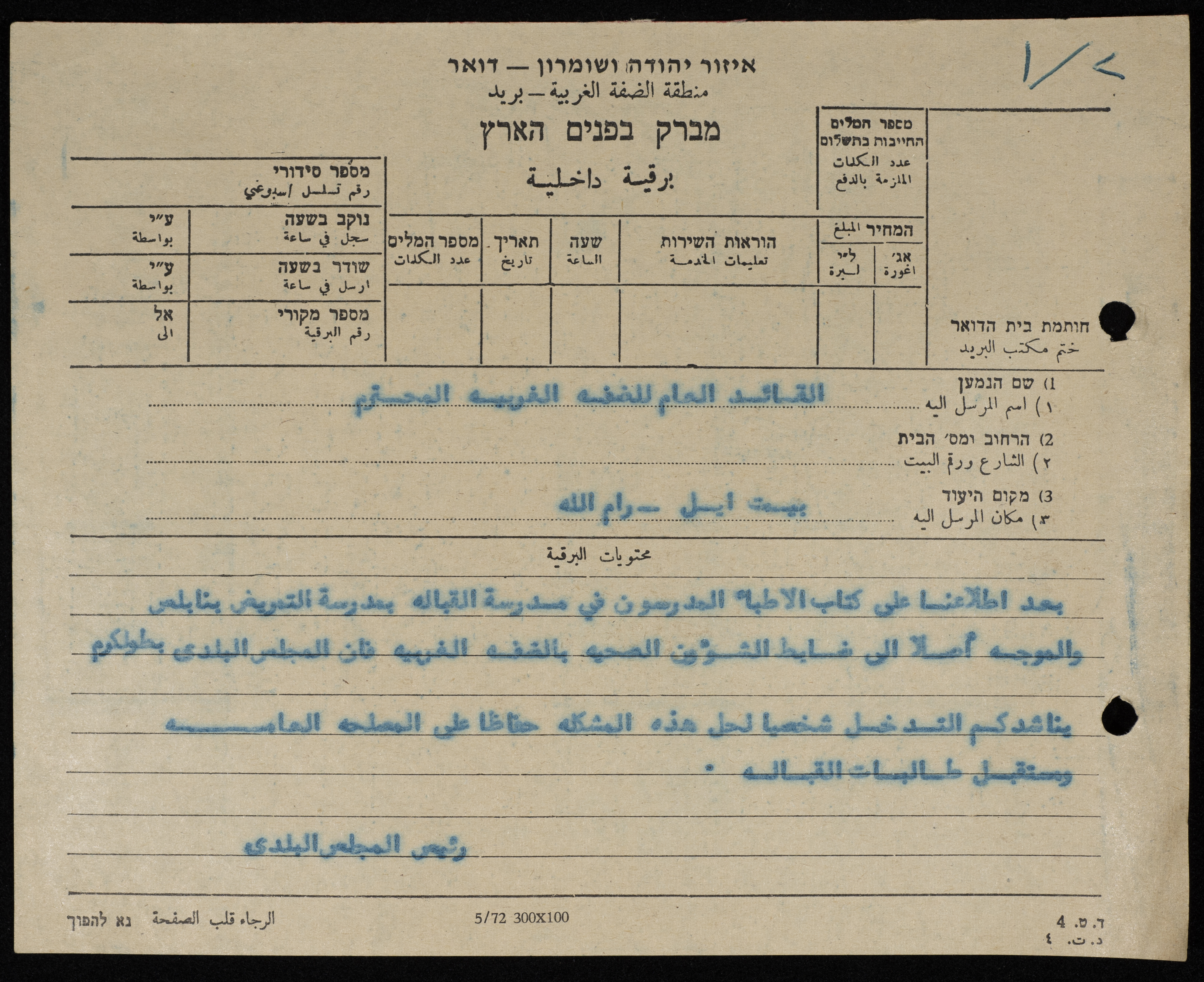 برقية مرسلة من رئيس بلدية طولكرم إلى الحاكم العسكري للضفة الغربية