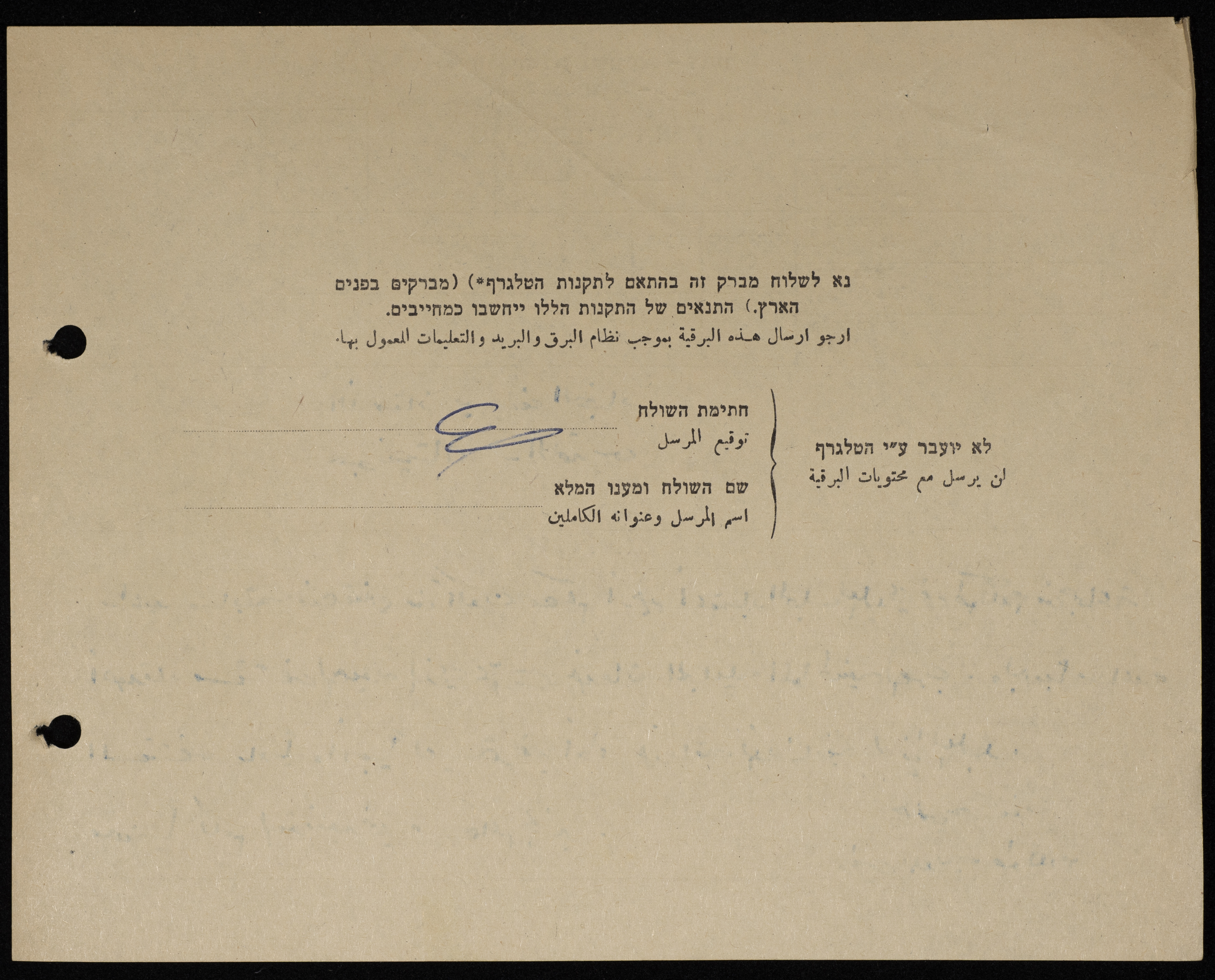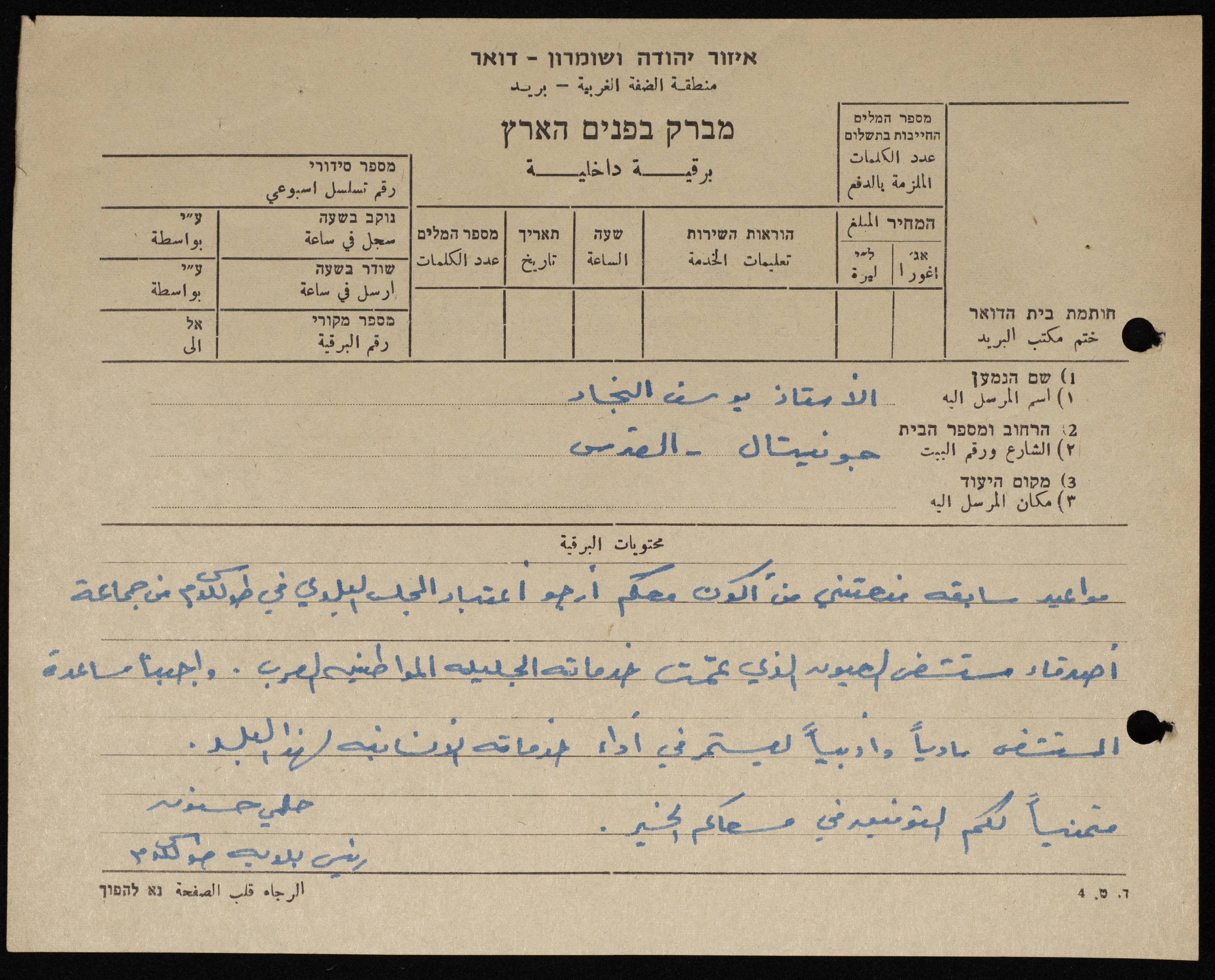برقية مرسلة من رئيس بلدية طولكرم إلى يوسف النجار