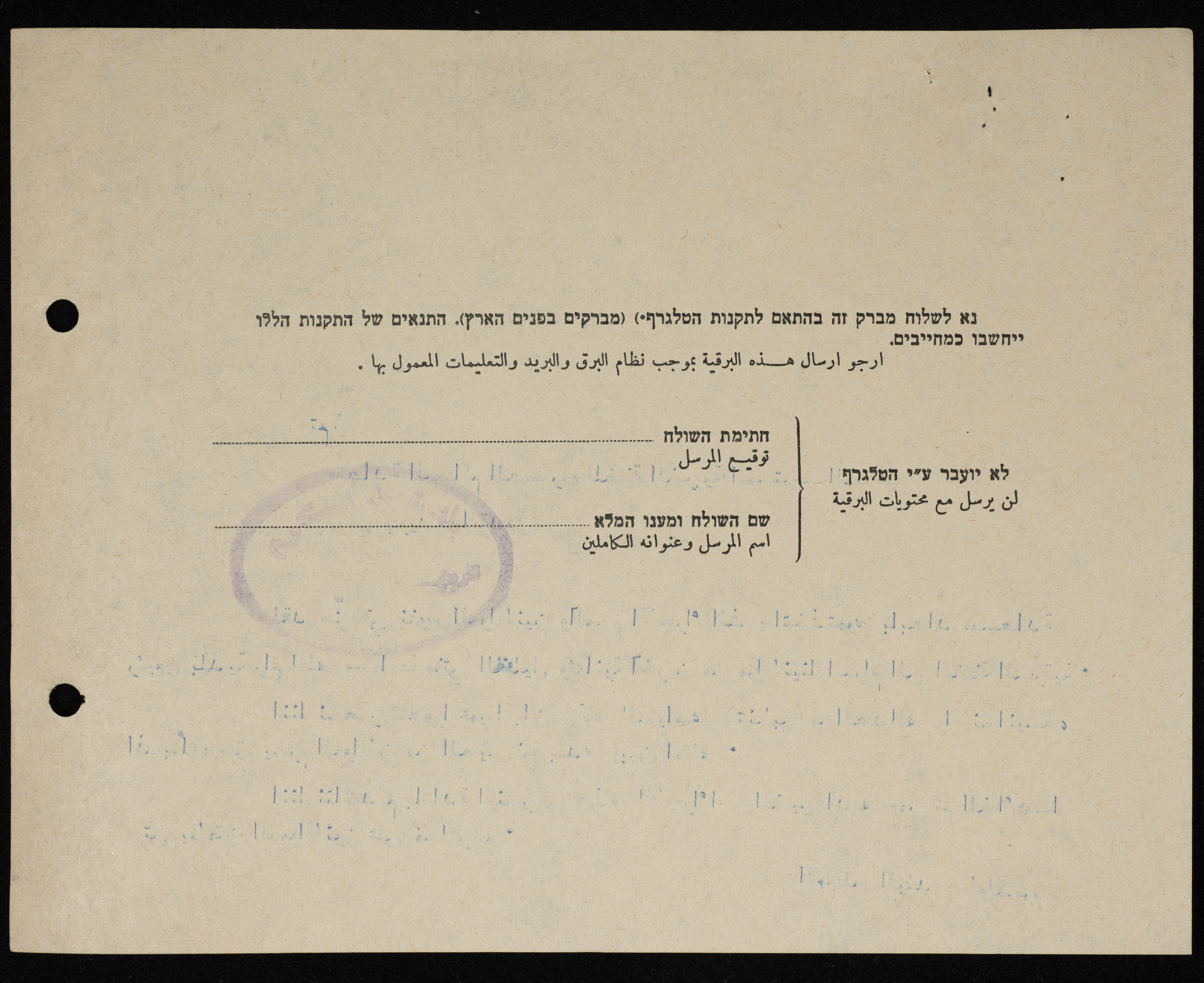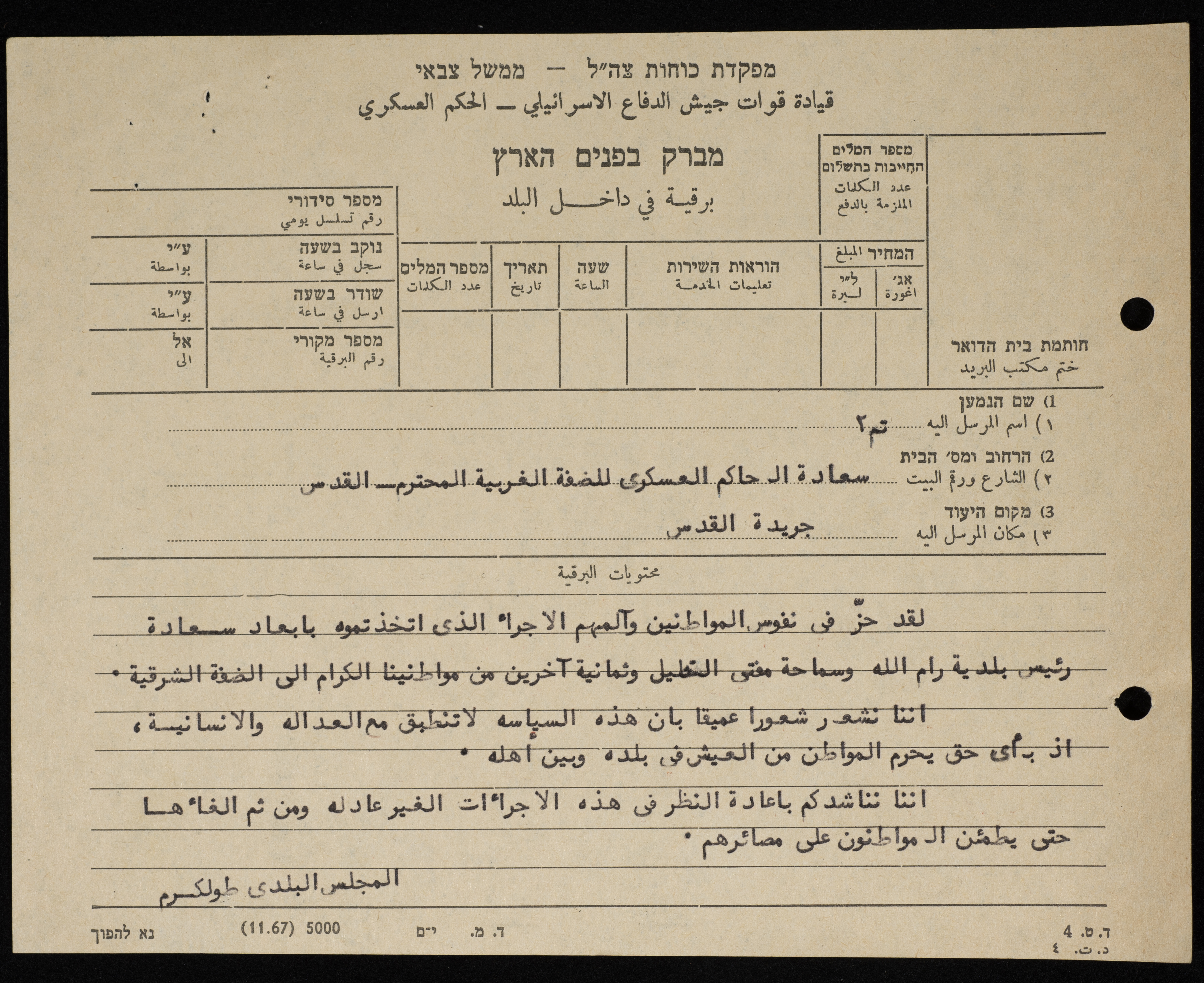 برقية مرسلة من رئيس بلدية طولكرم إلى الحاكم العسكري للضفة الغربية