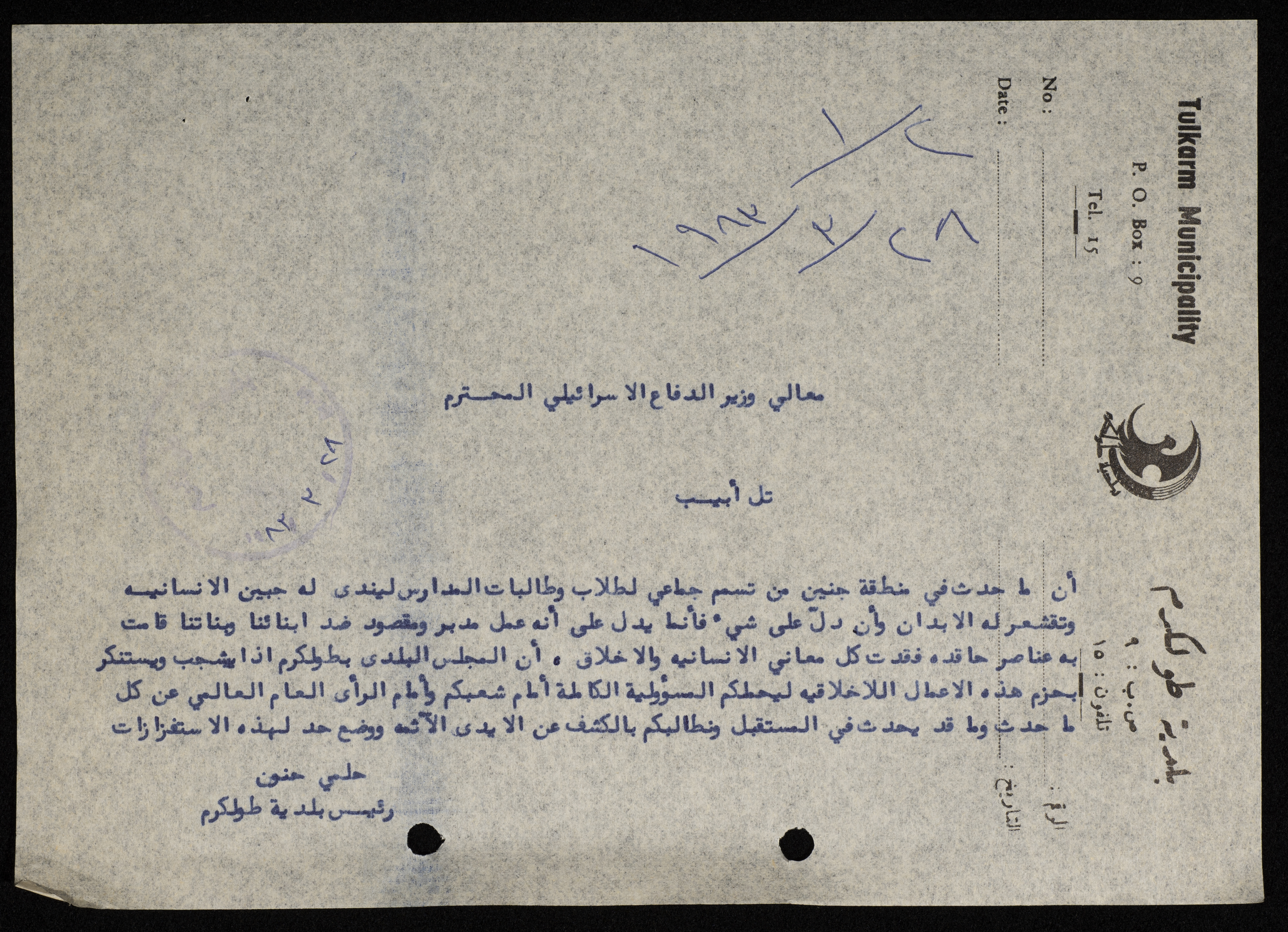 برقية مرسلة من رئيس بلدية طولكرم إلى وزير الحرب الاسرئيلي