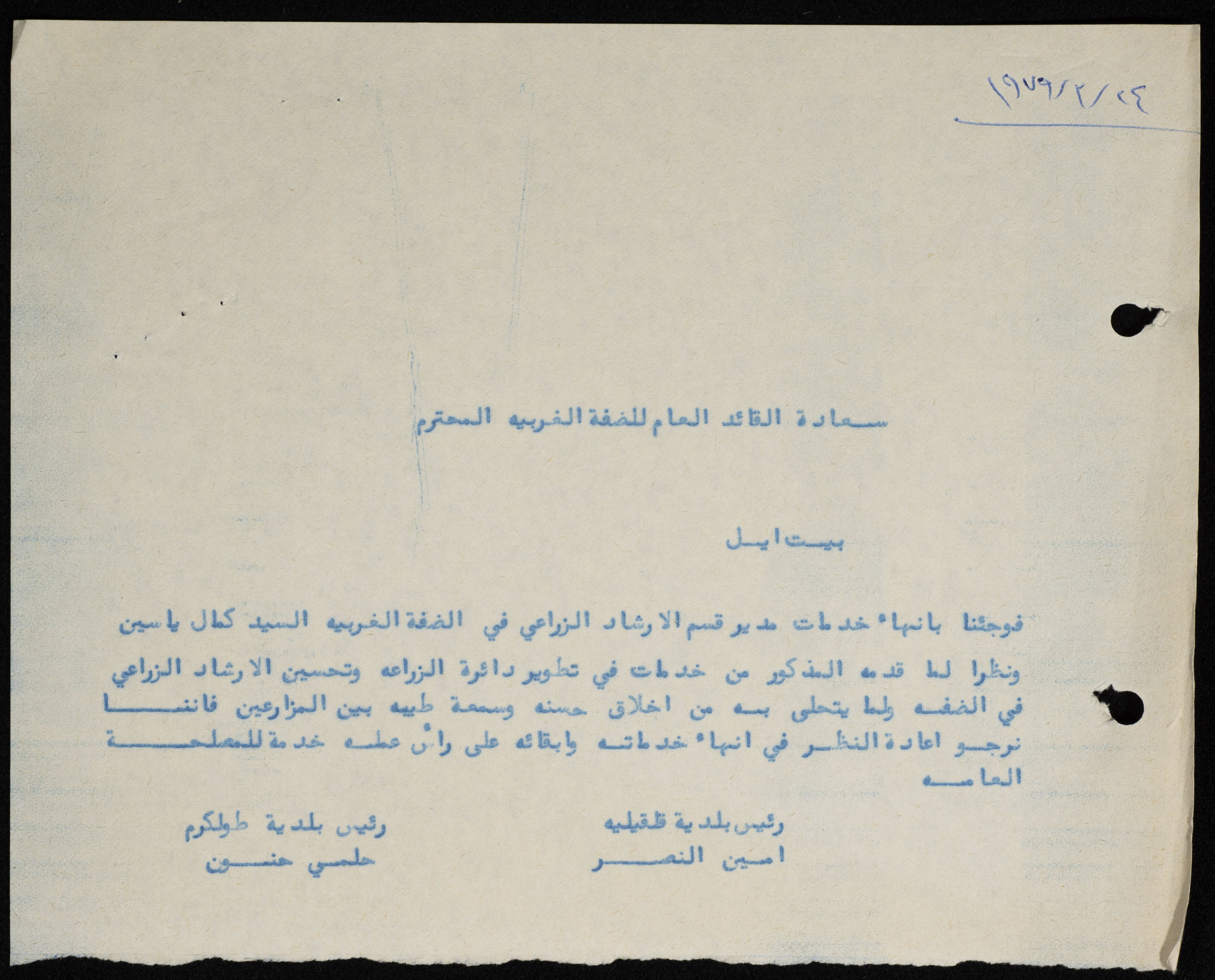 وثيقة مكونة من صفحة واحدة تتضمن برقية مرسلة من رئيس بلدية طولكرم، حلمي حنون إلى الحاكم العسكري للضفة الغربية، طلب فيها حلمي حنون اإعادة النظر في انهاء خدملت مدير قسم الإرشاد الزراعي.