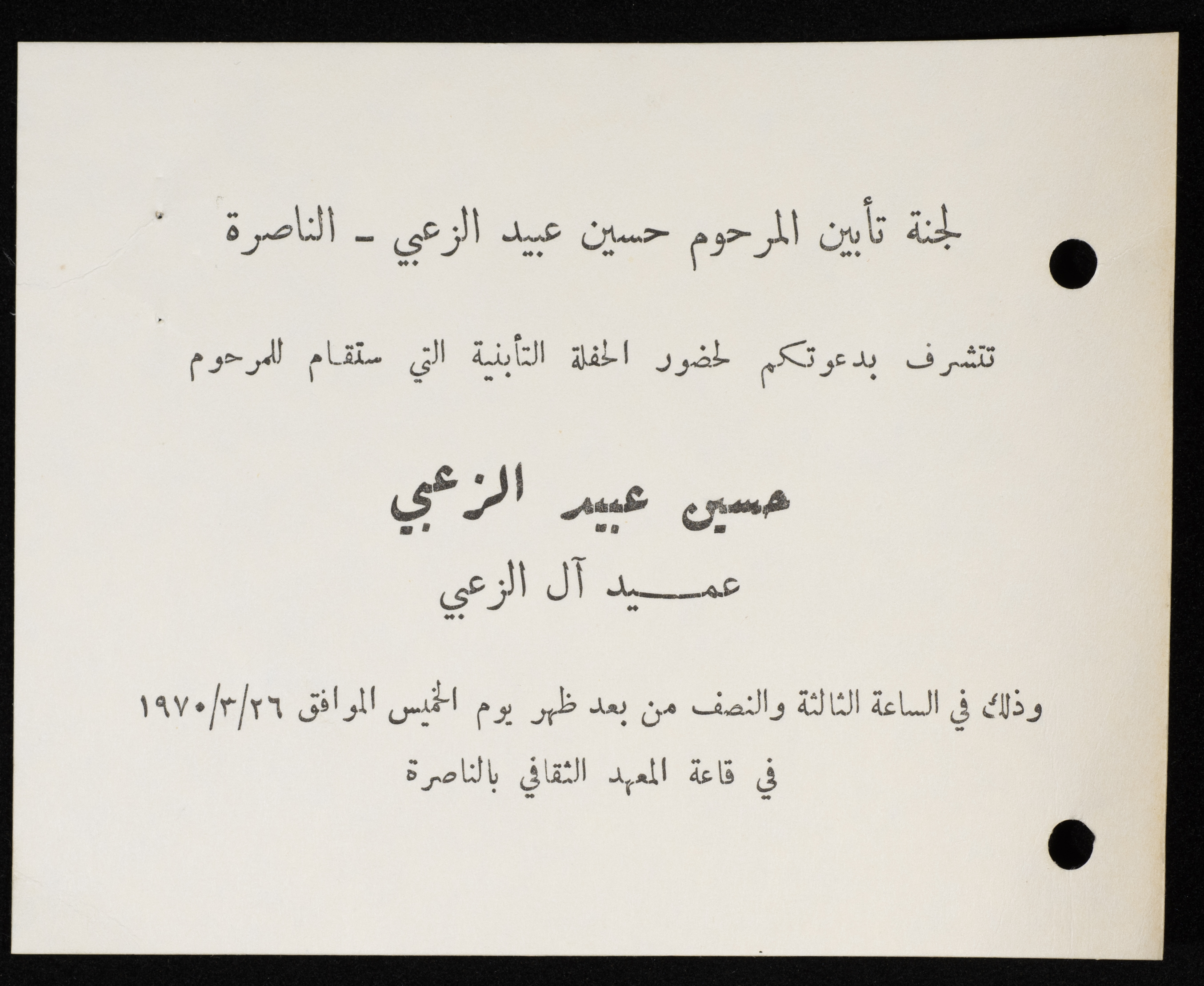 Invitation Card to Attend a Memorial Service for Hasan az-Zuʿby