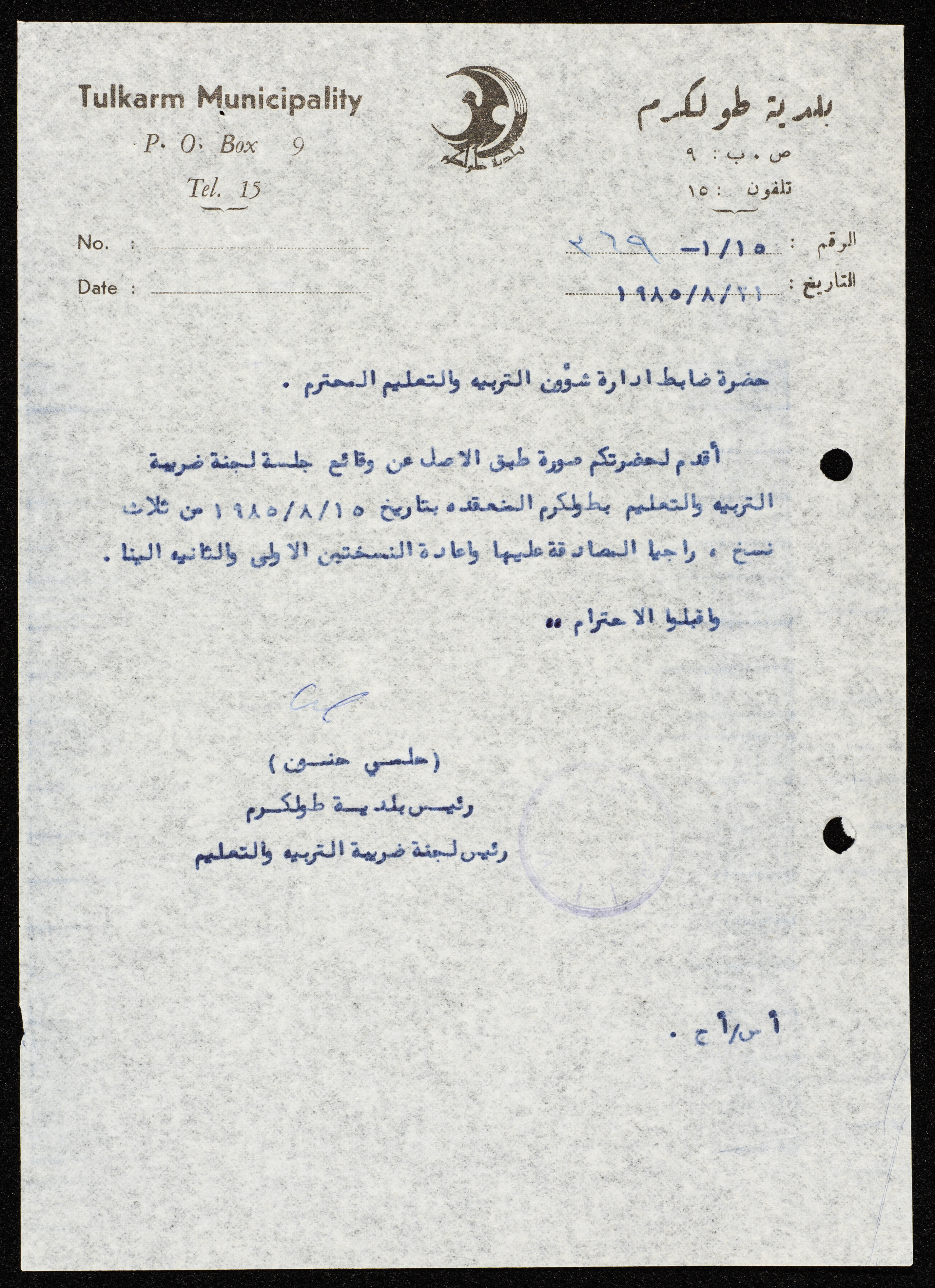 وثيقة مكونة من صفحة واحدة تتضمن كتاب موجه من رئيس بلدية طولكرم، حلمي حنون إلى ضابط إدارة شؤون التربية والعليم، ارفق رئيس البلدية مع الكتاب وقائع جلسة لجنة ضريبة التربية والتعليم التي انعقدت بتاريخ 15/8/1985.