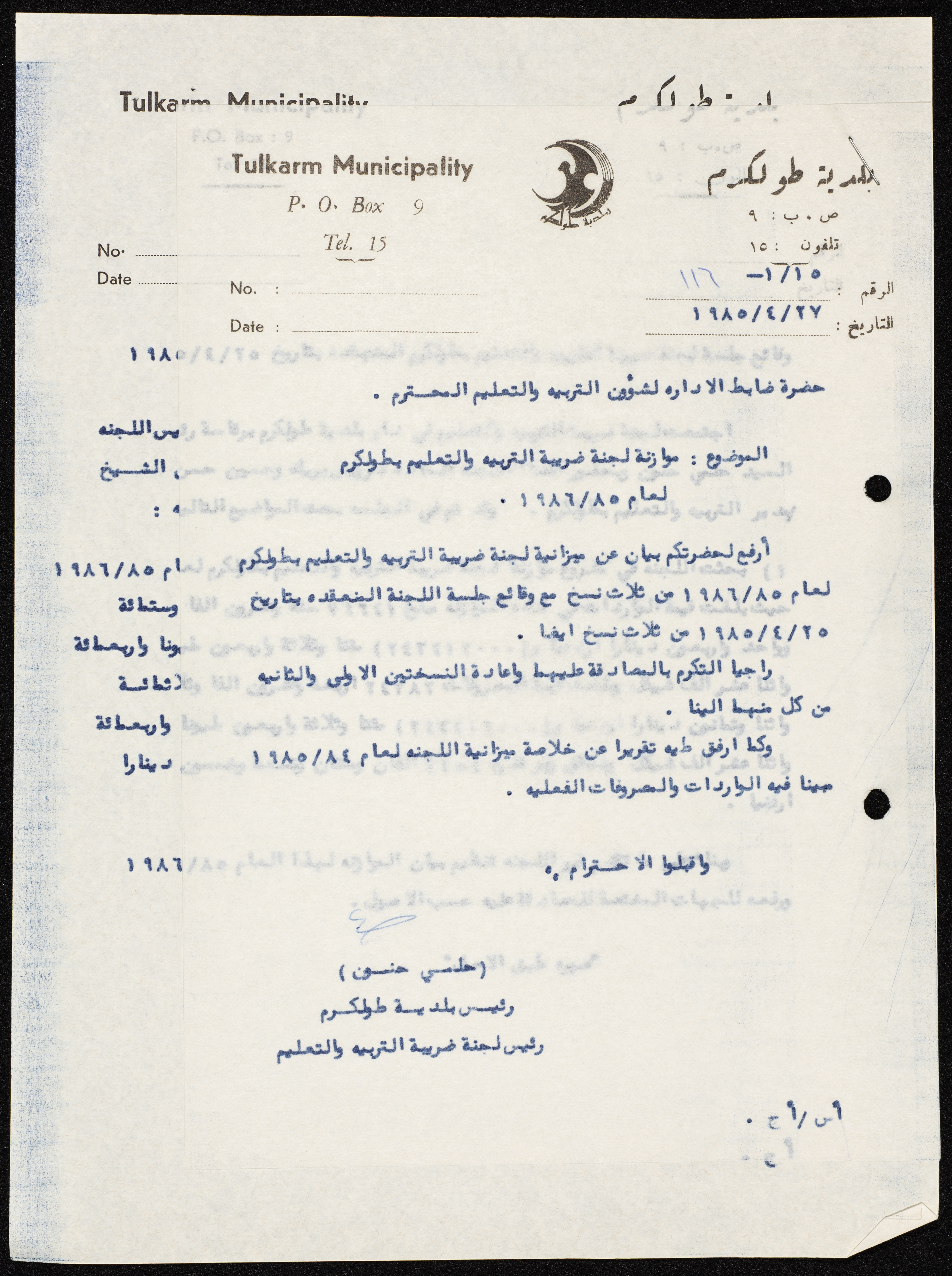 وثيقة مكونة من صفحة واحدة تتضمن كتاب موجه من رئيس بلدية طولكرم، حلمي حنون إلى ضابط الإدارة لشؤون التربية والتعليم أرفق رئيس البلدية مع الكتاب نسخة عن ميزانية لجنة ضريبة التربية والتعليم في طولكرم لعام 1985- 1986.