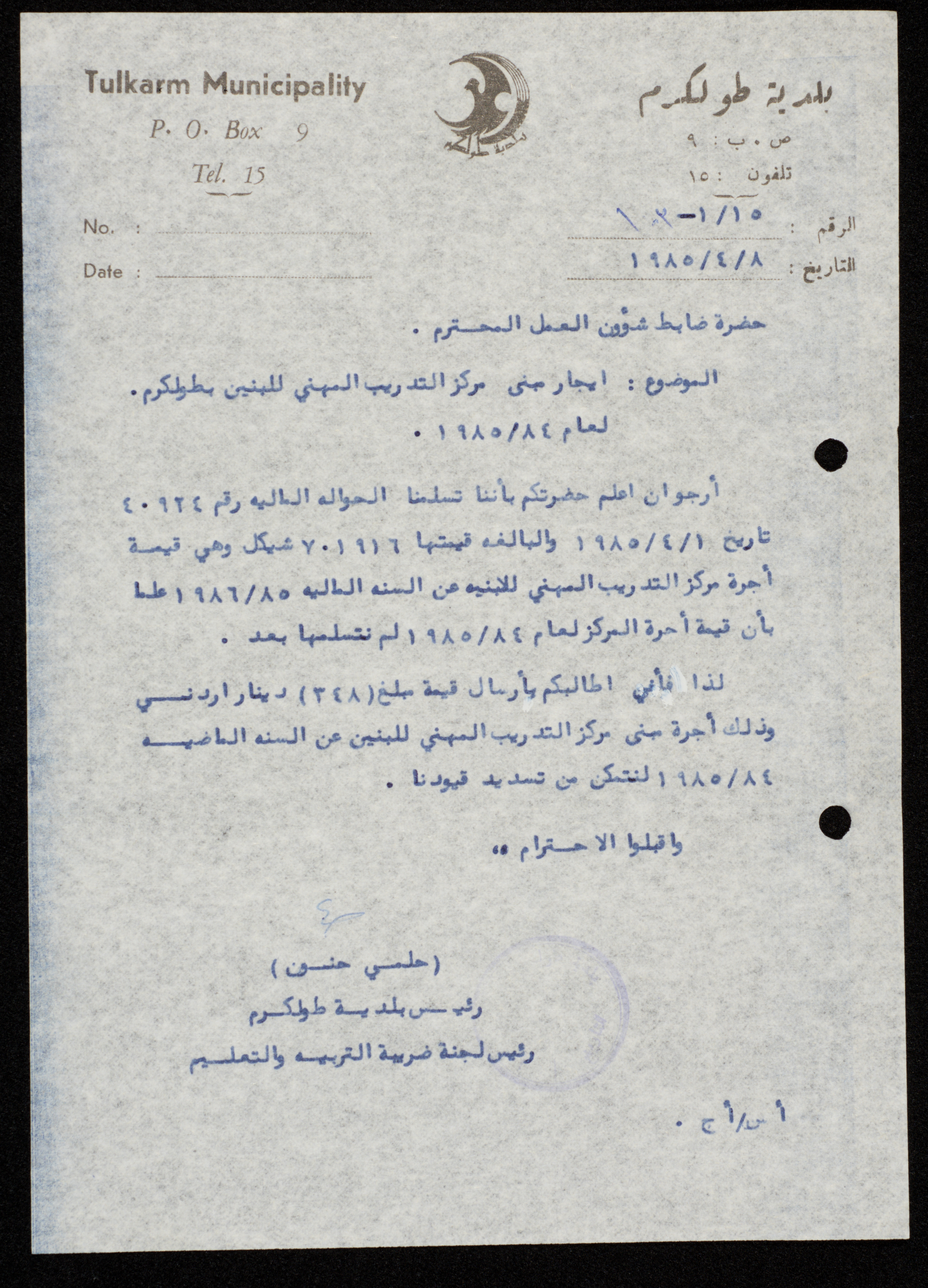 وثيقة مكونة من صفحة واحدة تتضمن كتاب موجه من رئيس بلدية طولكرم، حلمي حنون إلى ضابط شؤون العمل في الإدارة المدنية، تضمن الكتاب المطالبة بايجار مبنى مركز التدريب المهني لبنين في طولكرم.