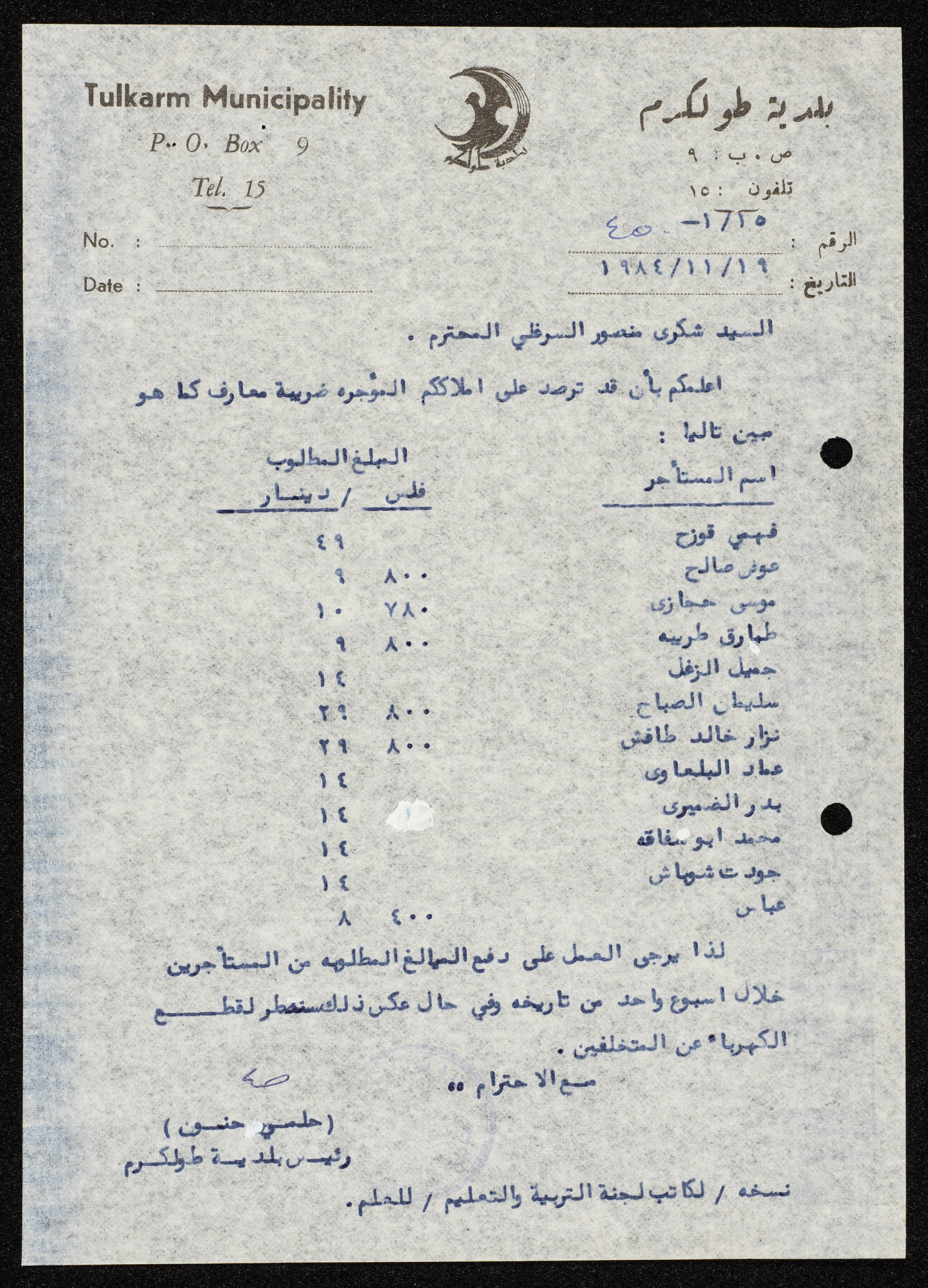 وثيقة مكونة من صفحة واحدة تتضمن كتاب موجه من رئيس بلدية طولكرم، حلمي حنون إلى شكري نتصور السرغلي، تضمن المطالبة بضريبة العارف على أملاكه المؤجرة.