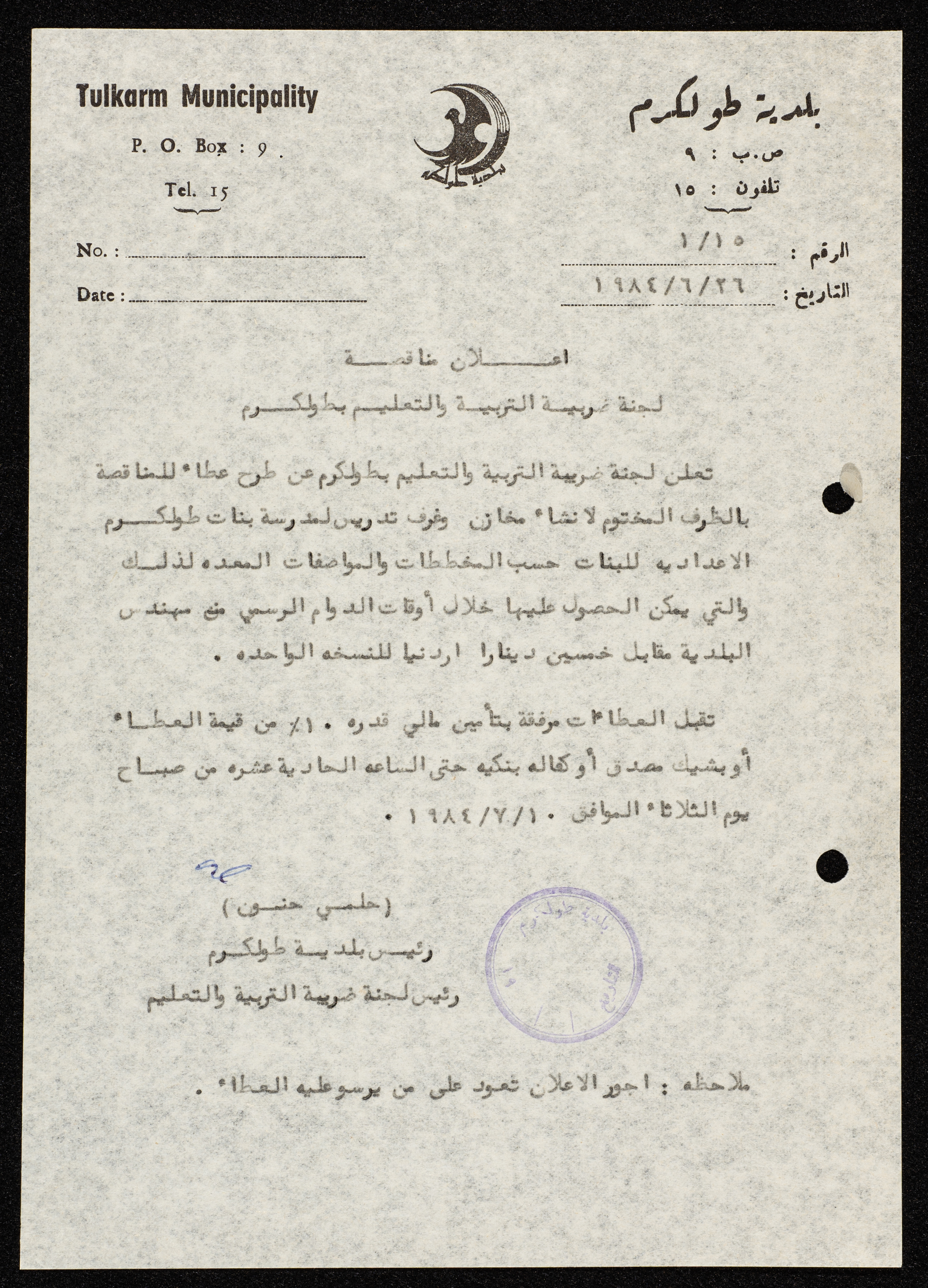 وثيقة مكونة من صفحة واحدة تتضمن إعلانمناقصة صادرة عن لجنة التربية والتعليم بطولكرم، من أجل انشاء مخازن وغرف تدريس لمدرسة بنات طولكرمالاعدادية.