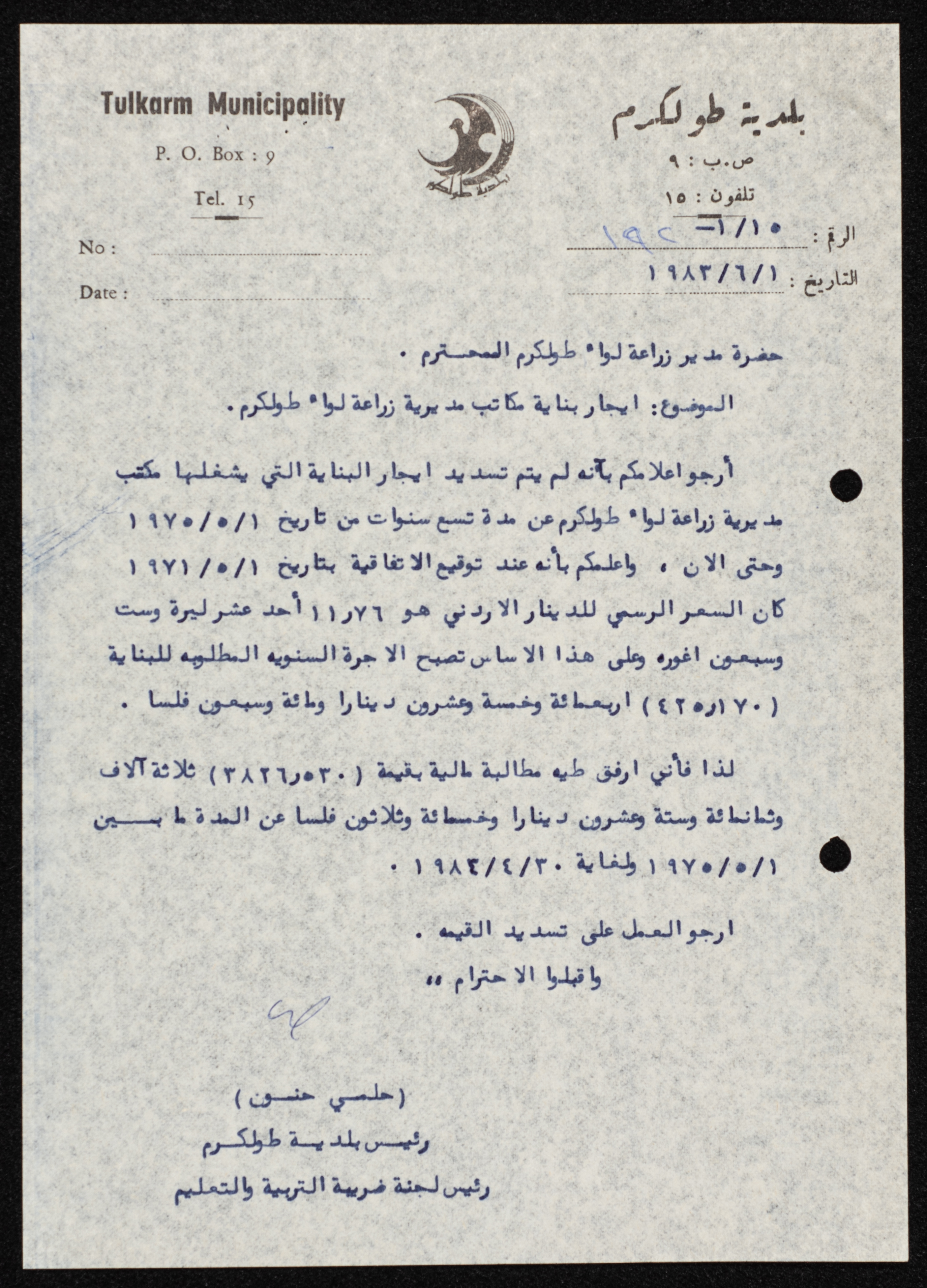 وثيقة مكونة من صفحة واحدة تتضمن كتاب موجه من رئيس بلدية طولكرم، حلمي حنون إلى مدير زراعة لواء طولكرم، تضمن الكتاب المطالبة بتسديد ايجار بناية مكاتب مديرية زراعة لواء طولكرم.