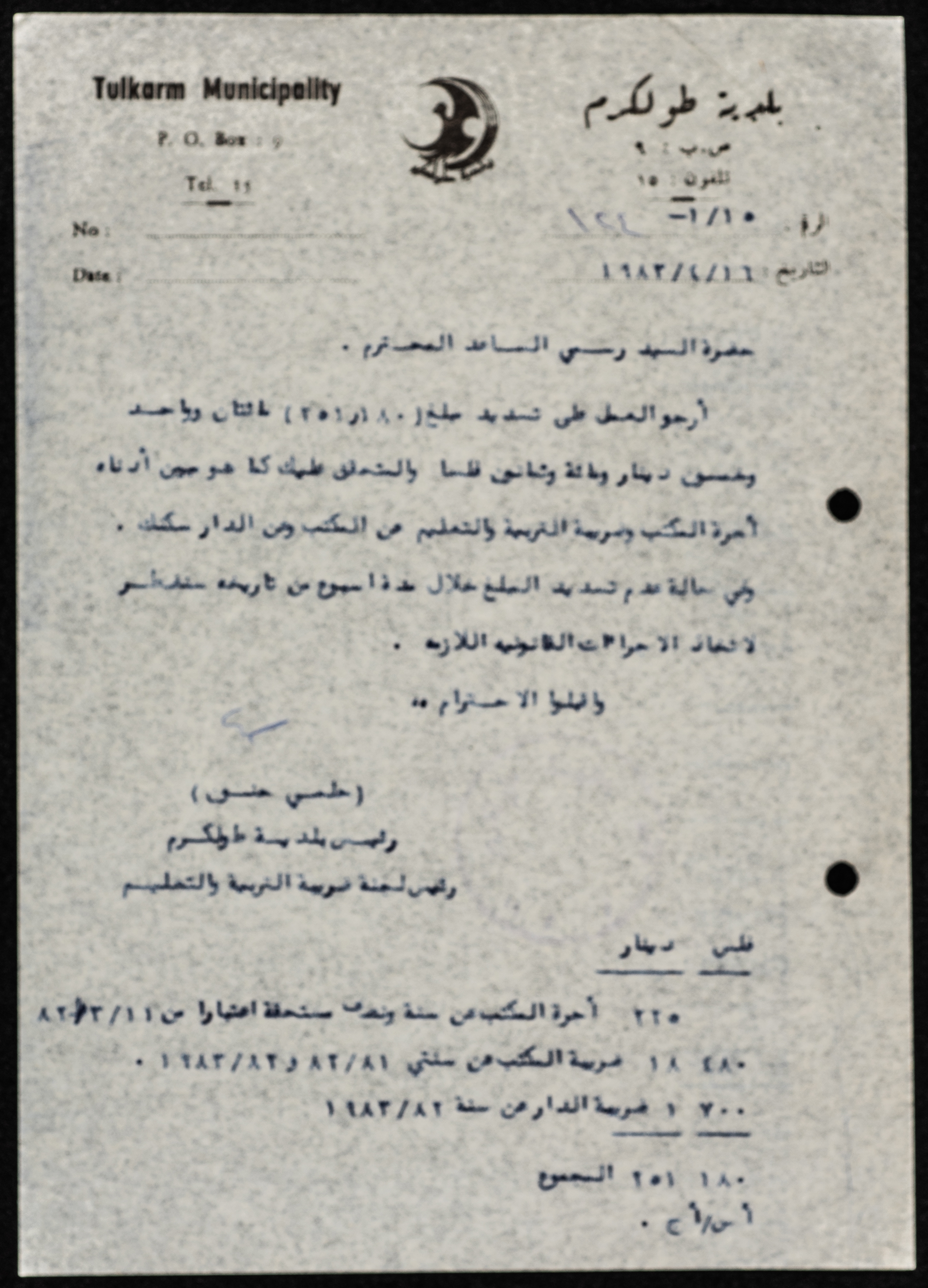 وثيقة مكونة من صفحة واحدة تتضمن كتاب موجه من رئيس بلدية طولكرم، حلمي حنون إلى القاضي رسمي الساعد، تضمن الكتاب المطالبة بتسديد أجرة مكتب القاضي والذي تملكه لجنة ضريبة التربية والتعليم.