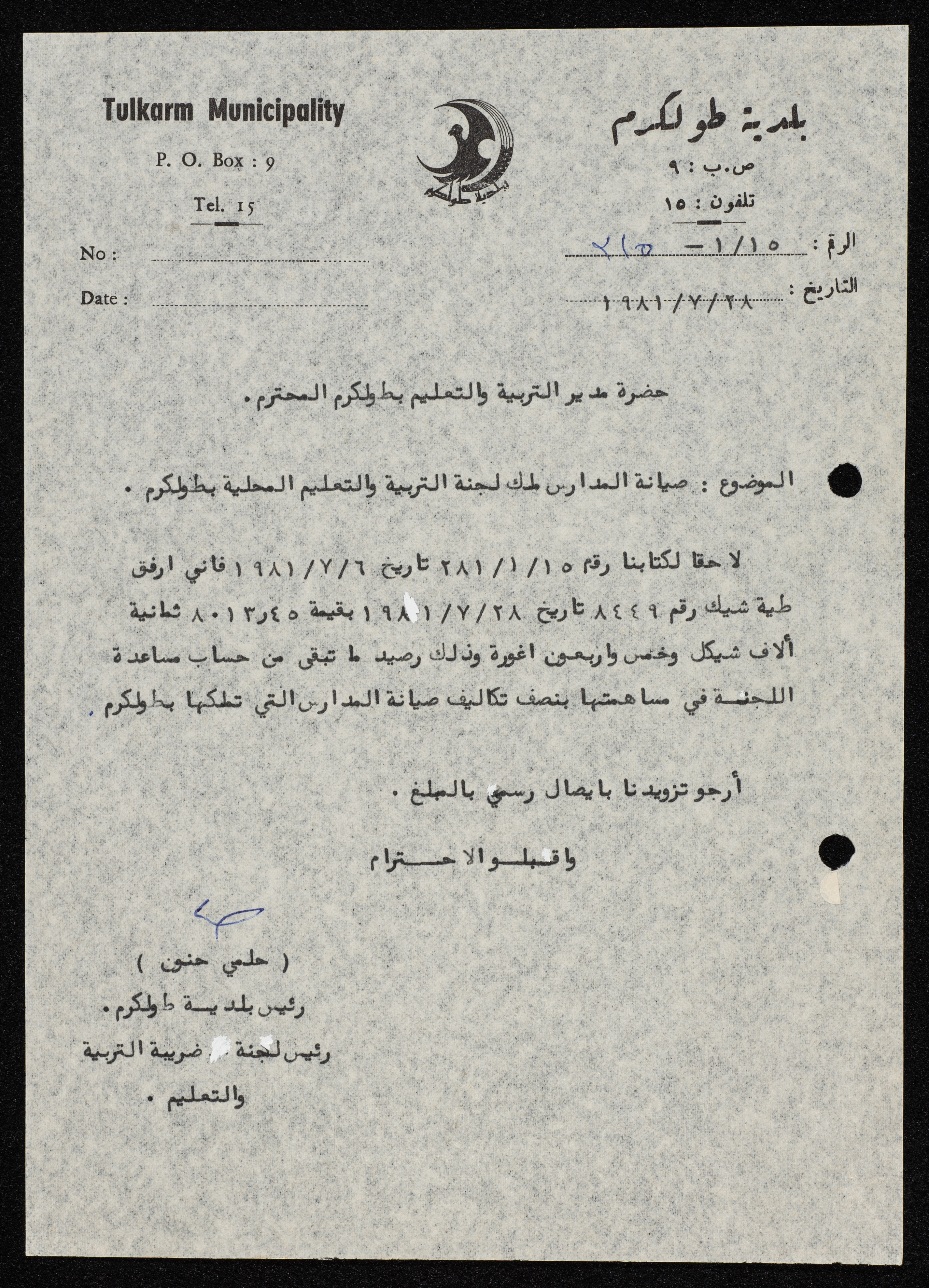 وثيقة مكونة من صفحة واحدة تتضمن كتاب موجه من رئيس بلدية طولكرم، حلمي حنون إلى مدير التربية والتعليم بطولكرم، تضمن الكتاب ارفاق شيك بمبلغ مالي كمساهمة من لجنة ضريبة التربية والتعليم في صيانة المدارس التي تملكها اللجنة في طولكرم.
