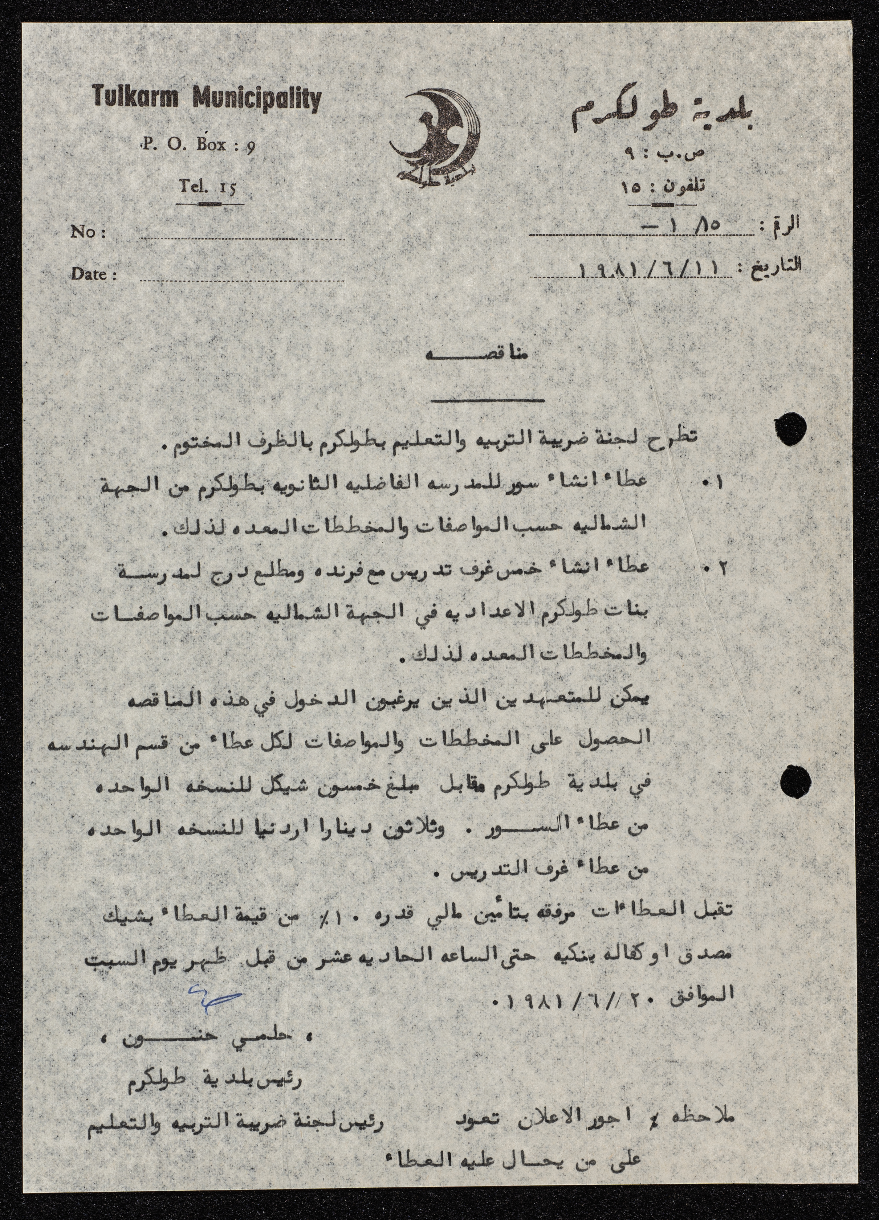 عزريل، سمر. "مجموعة بلديّة طولكرم"، جرد أرشفي، 20 كانون الثاني– 10 شباط 2019، أرشيف المتحف الفلسطيني الرقمي.