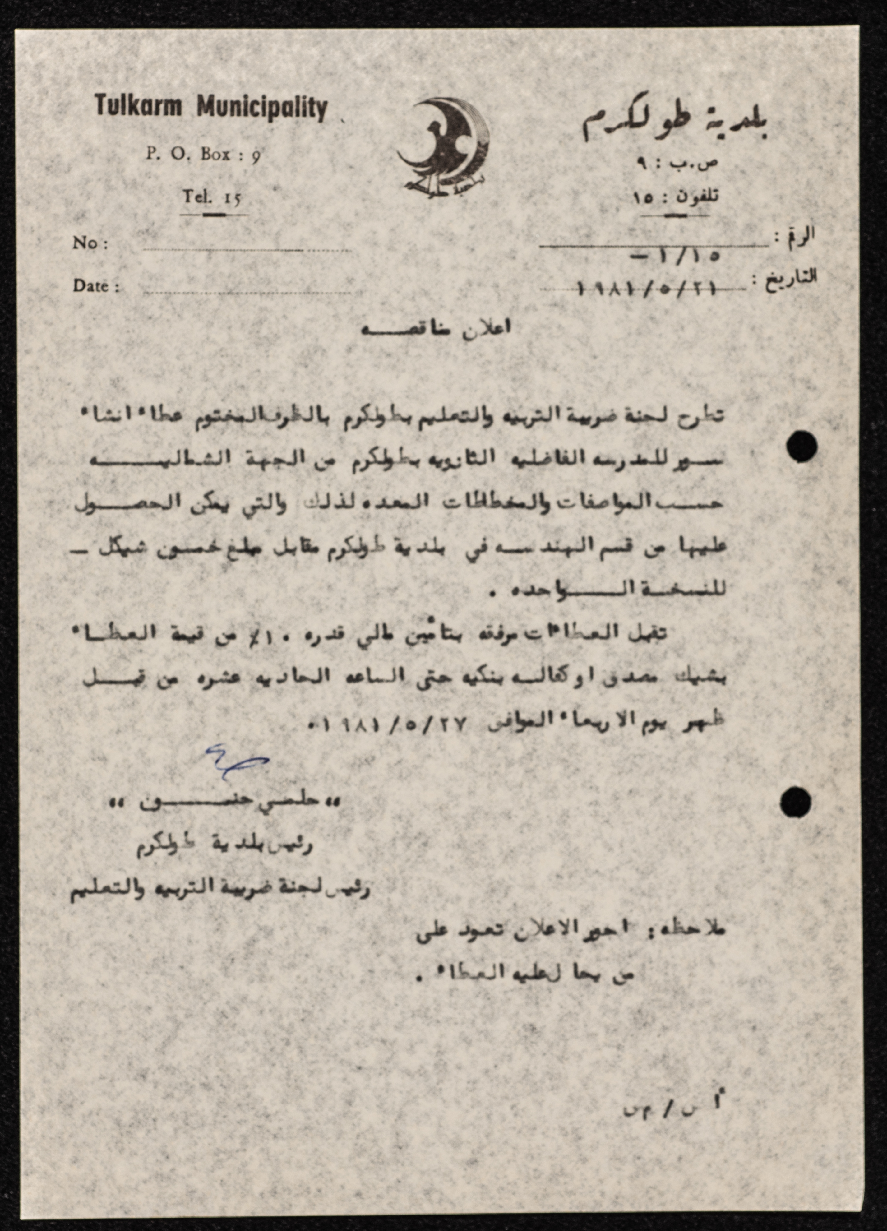 Ozrail, Samar, "The Tulkarm Municipality Collection", archival collection, 20 January – February 2019, the Palestinian Museum Digital Archive.
