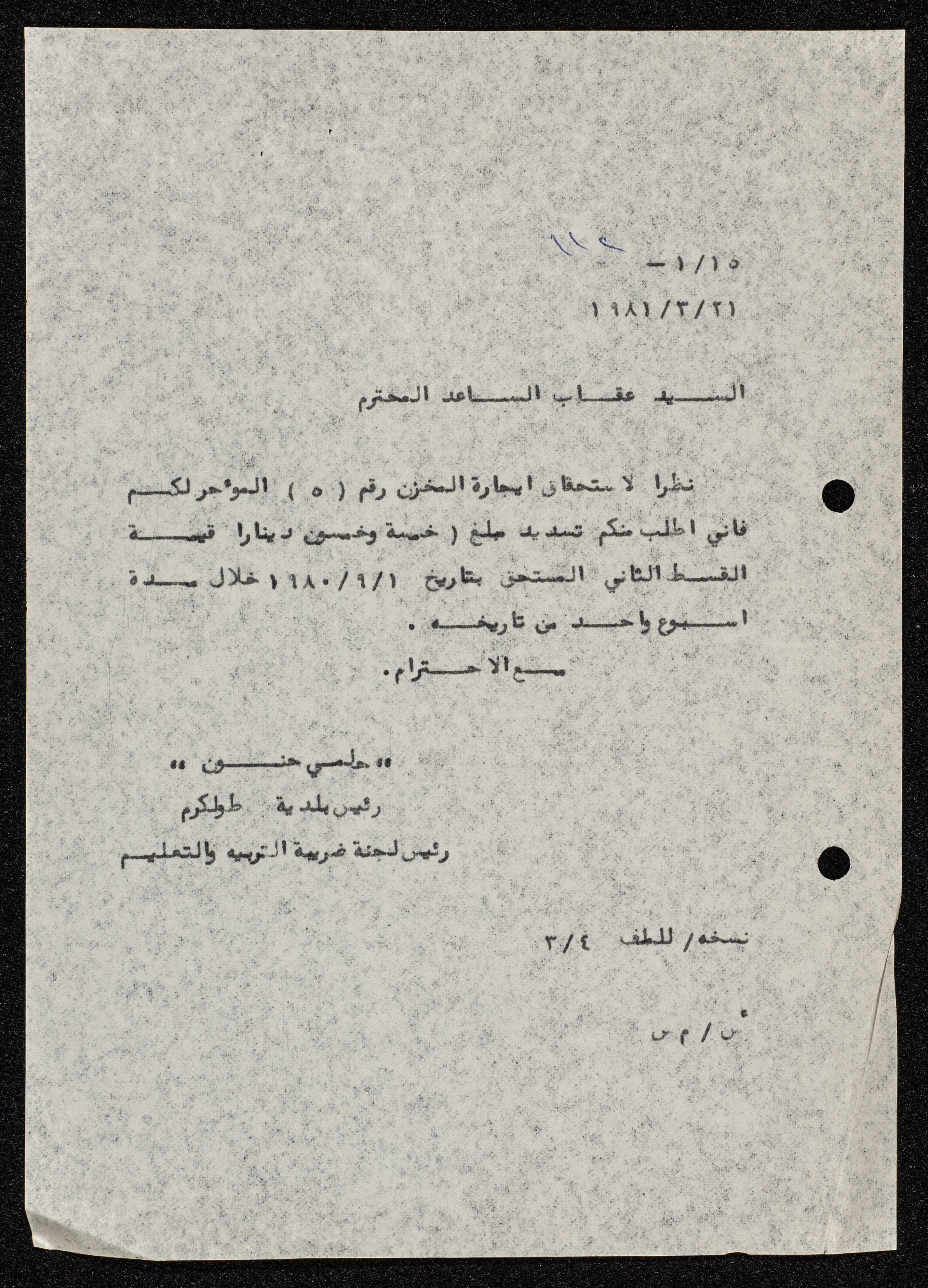 A letter from the mayor of Tulkarm, Hilmy Hannun to ʿoqab as-Saʿed, asking him to pay the rent for the storehouse he is renting from the education tax committee.