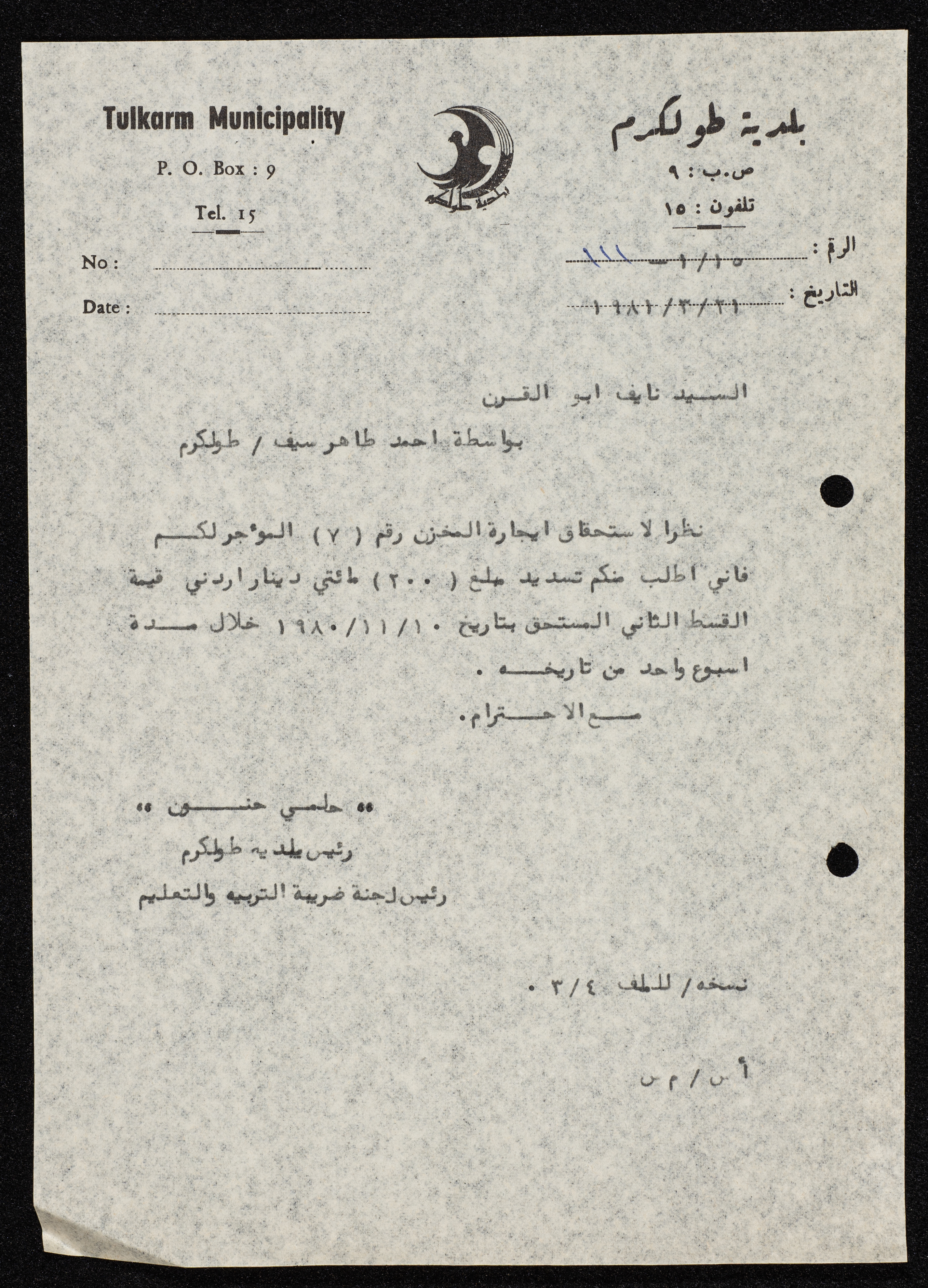 وثيقة مكونة من صفحة واحدة تتضمن كتاب موجه من رئيس بلدية طولكرم، حلمي حنون إلى نايف أبو القرن، طلب رئيس البلدية في الكتاب من أبو القرن تسديد ايجار المخزن الستأجر من أملاك لجنة ضريبة التربية والتعليم.