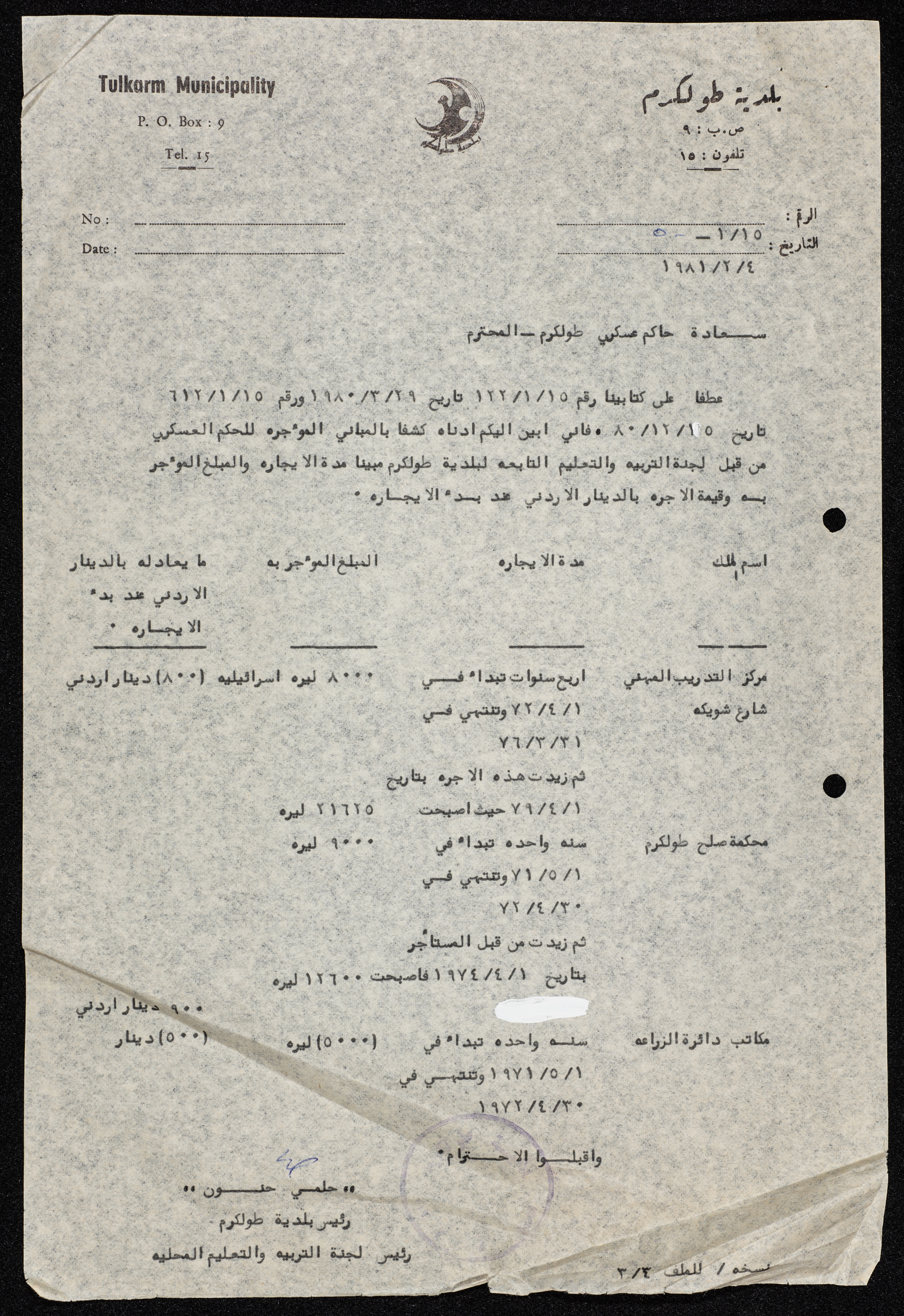 Ozrail, Samar, "The Tulkarm Municipality Collection", archival collection, 20 January – February 2019, the Palestinian Museum Digital Archive.