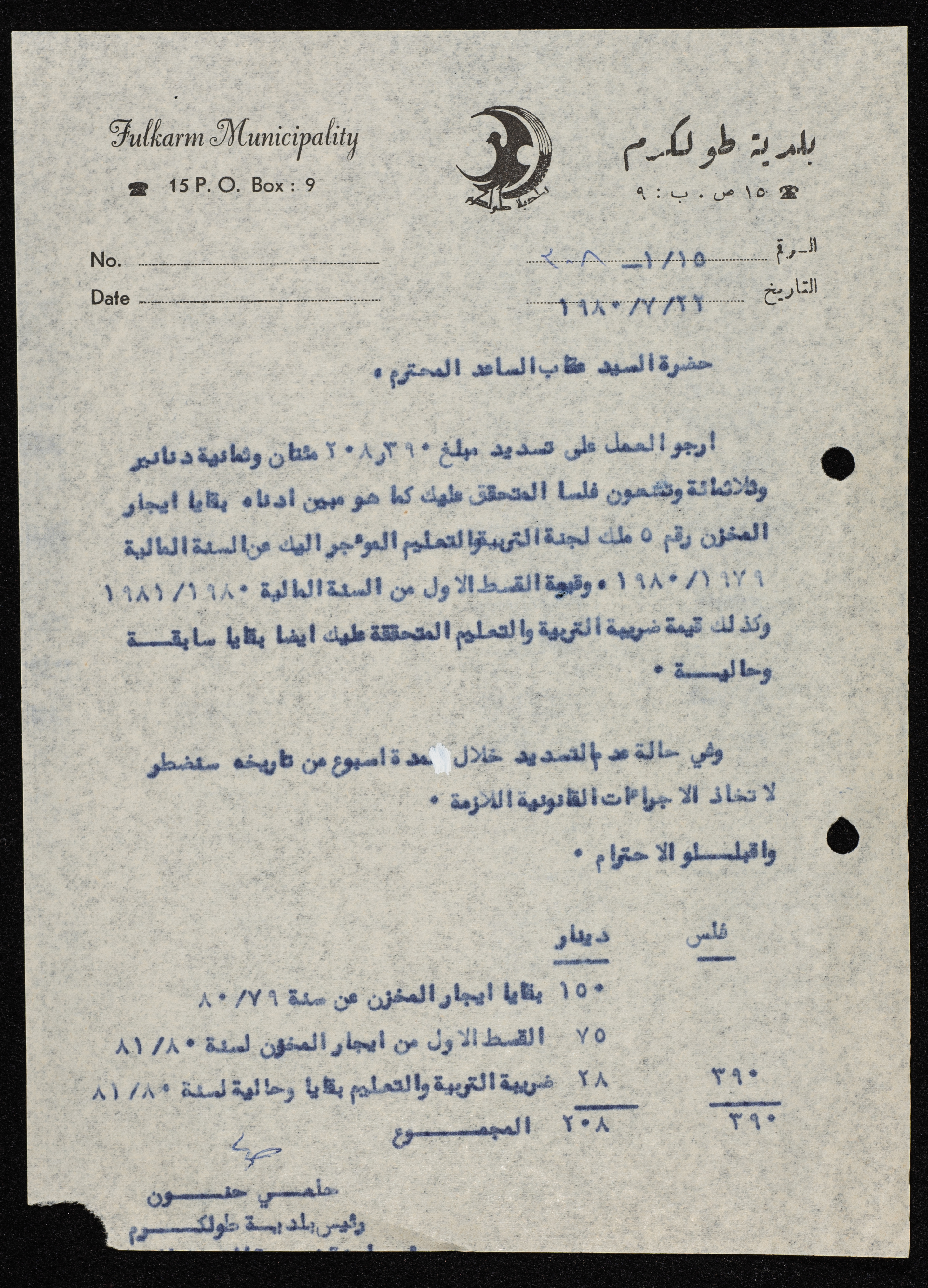 A letter from the mayor of Tulkarm, Hilmy Hannun to ʿoqab as-Saʿed, asking him to pay the rent for the storehouse he is renting from the education tax committee.