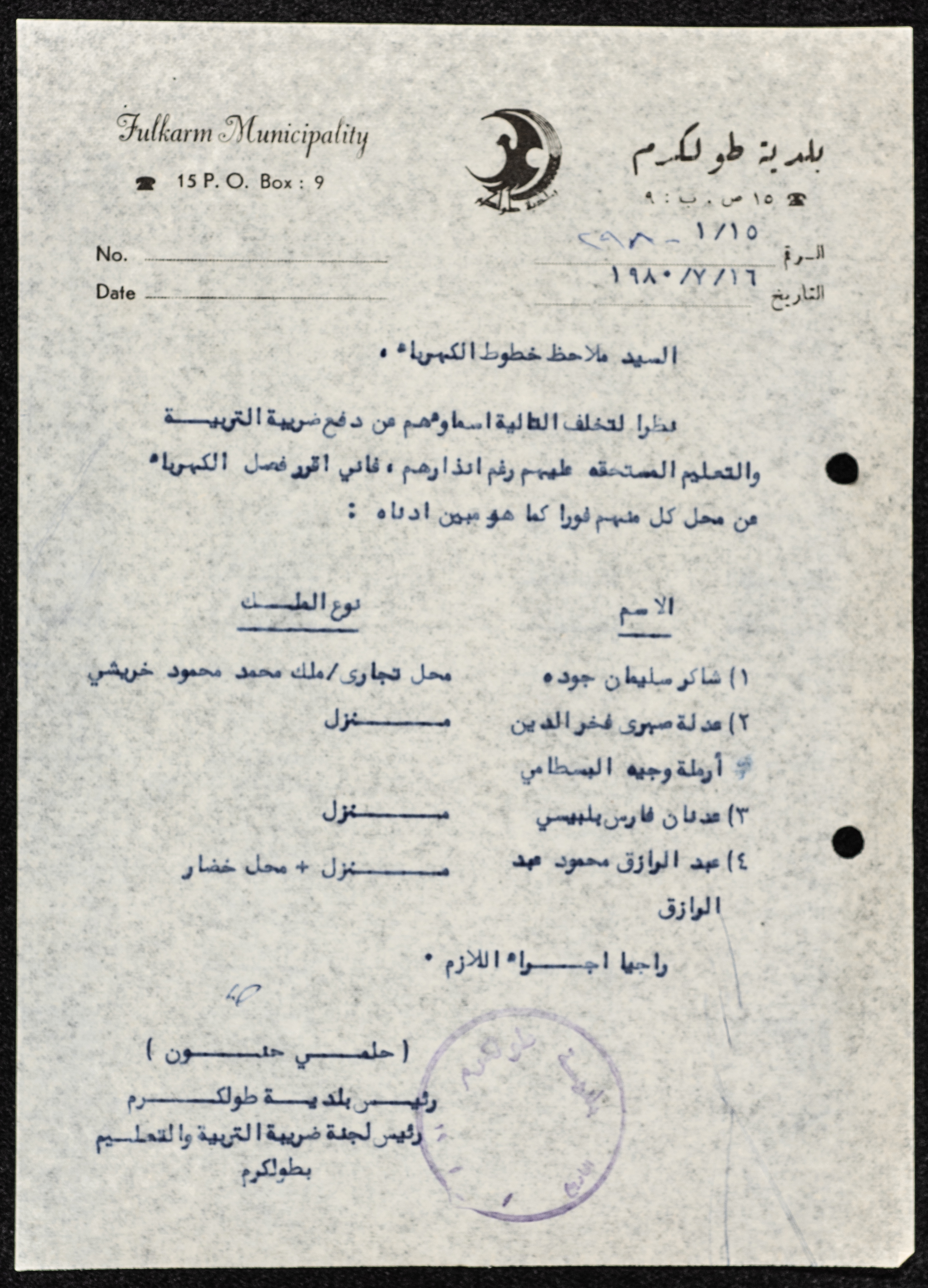 وثيقة مكونة من صفحة واحدة تتضمن كتاب موجه من رئيس بلدية طولكرم، حلمي حنون إلى ملاحظ خطوط الكهرباء، طلب حلمي حنون من الملاحظ في الكتاب فصل التيار الكهربائي عن المستأجرين أملاك من لجنة ضريبة التربية والتعليم بسبب تخلفهم عن دفع ضريبة التربية والتعليم.