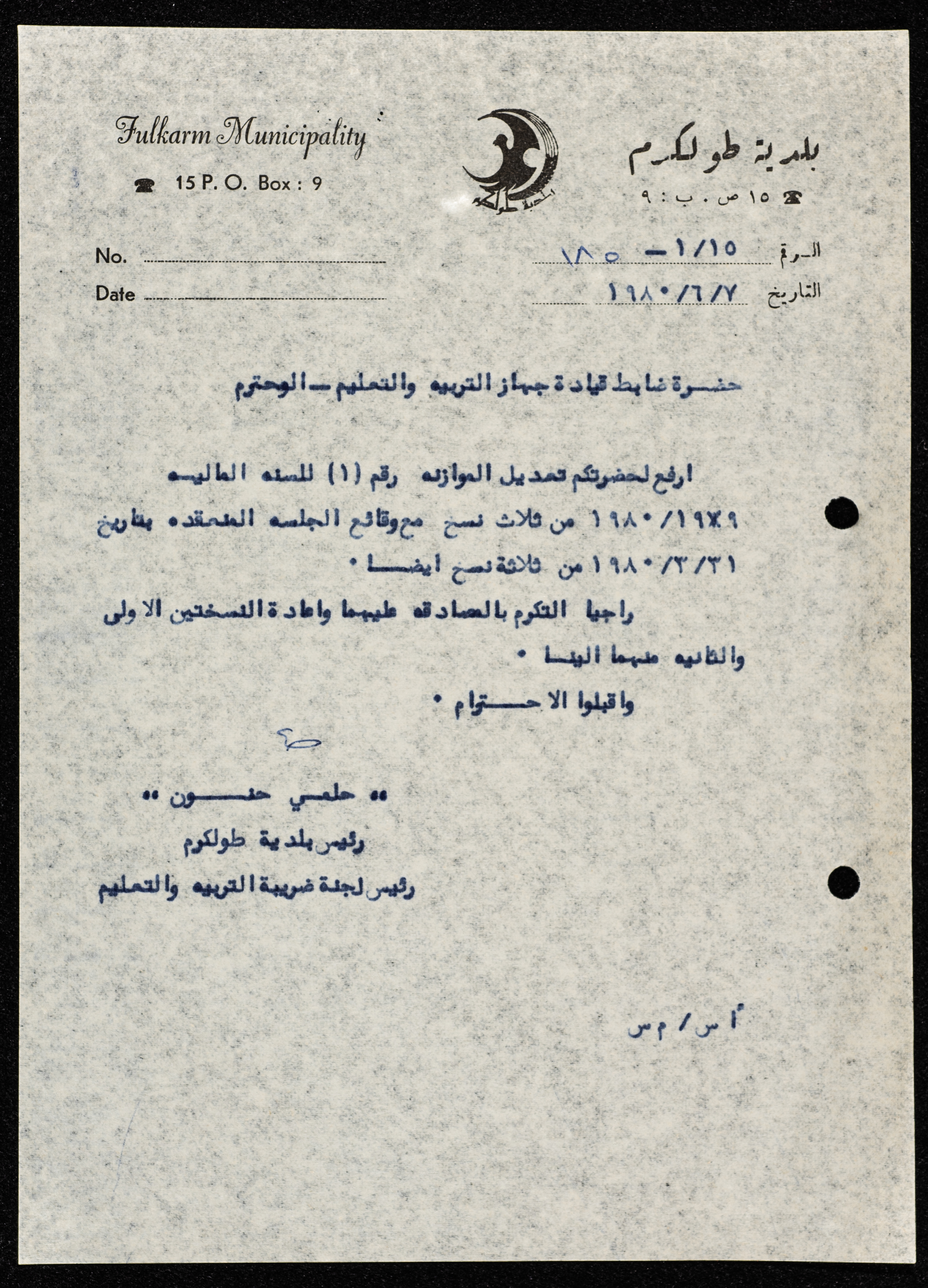 وثيقة مكونة من صفحة واحدة تتضمن كتاب موجه من رئيس بلدية طولكرم، حلمي حنون إلى مدير جهاز التربية والتعليم، أرفق رئيس البلدية في الكتاب تعديل موازنة لجنة ضريبة التربية والتعليم لعام 1980/1981.