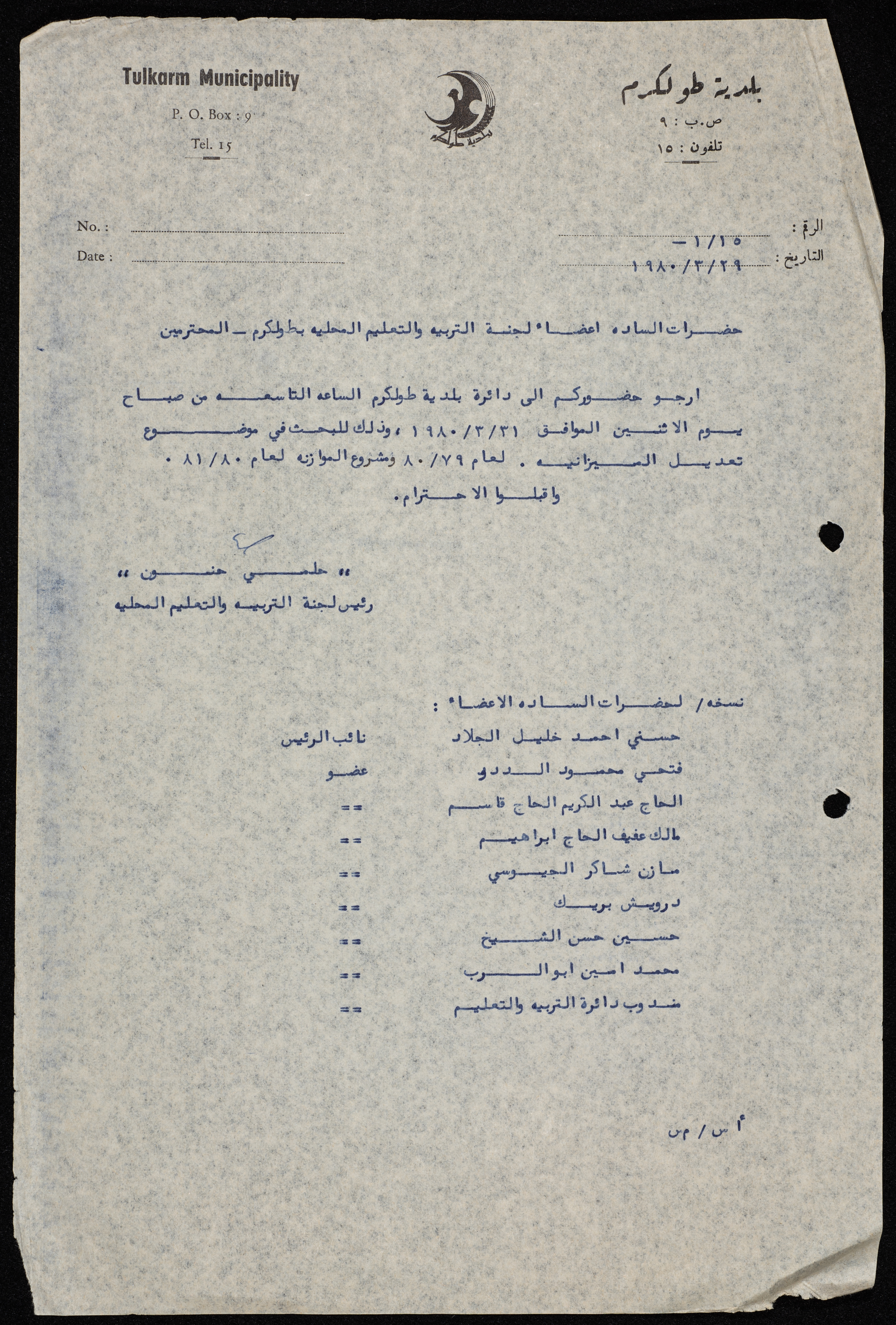 وثيقة مكونة من صفحة واحدة تتضمن دعوة موجهة من رئيس بلدية طولكرم، حلمي حنون إلى أعضاء لجنة التربية والتعليمن من أجل الحضور إلى مبنى البلدية لعقد اجتماع للجنة ومناقشة موضوع تعديل ميزانية اللجنة لعام 1980/1979، ومناقشة مشروع موازنة 1980/1981.