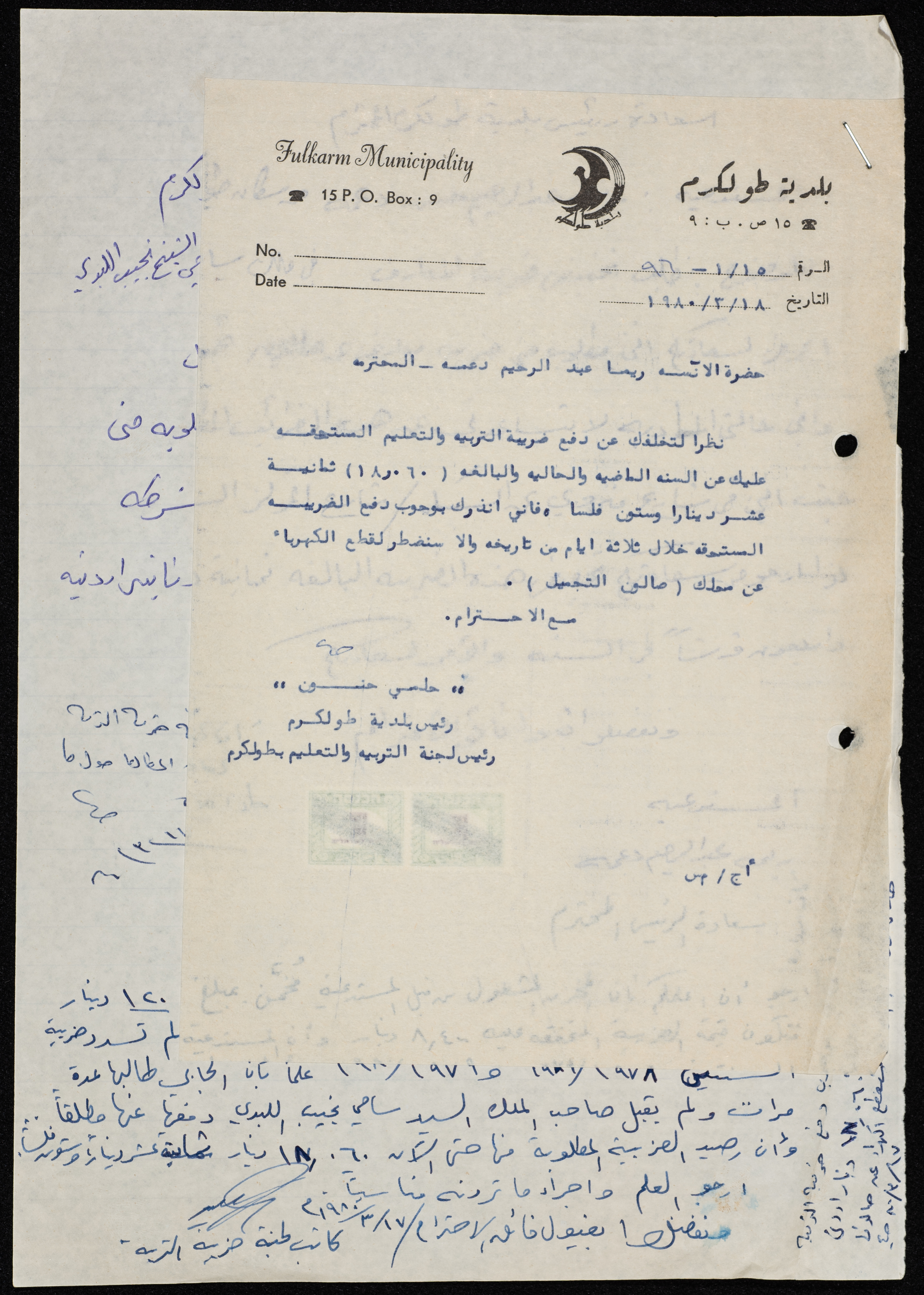 وثيقة مكونة من صفحة واحدة تتضمن كتاب موجه من رئيس بلدية طولكرم، حلمي حنون إلى ريما دعمة، طلب رئيس البلدية من ريما دعمة دفع قيمة ضريبة التربية والتعليم.