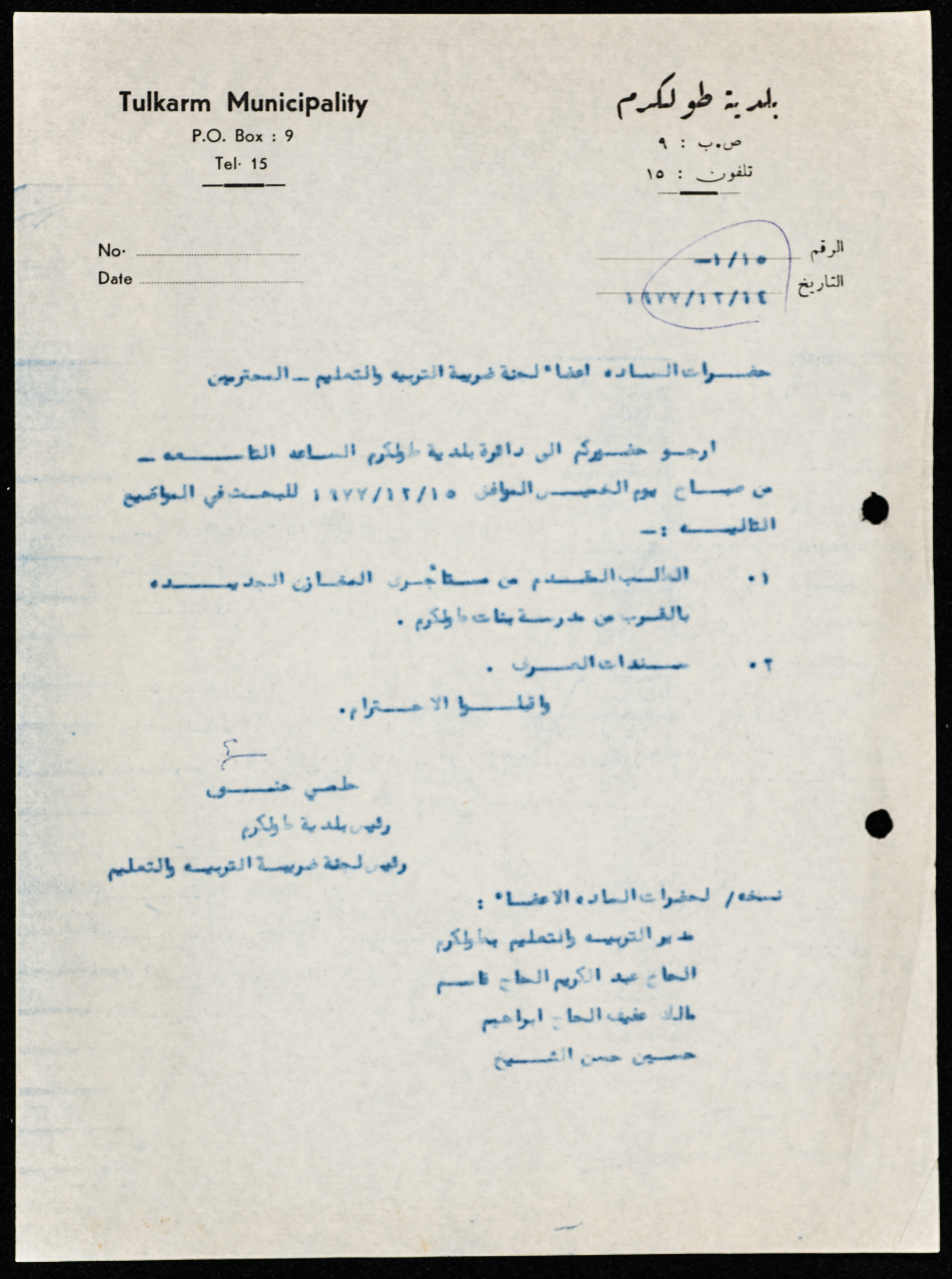 An invitation from the mayor of Tulkarm, Hilmy Hannun to members of the education tax committee, to attend a committee meeting.