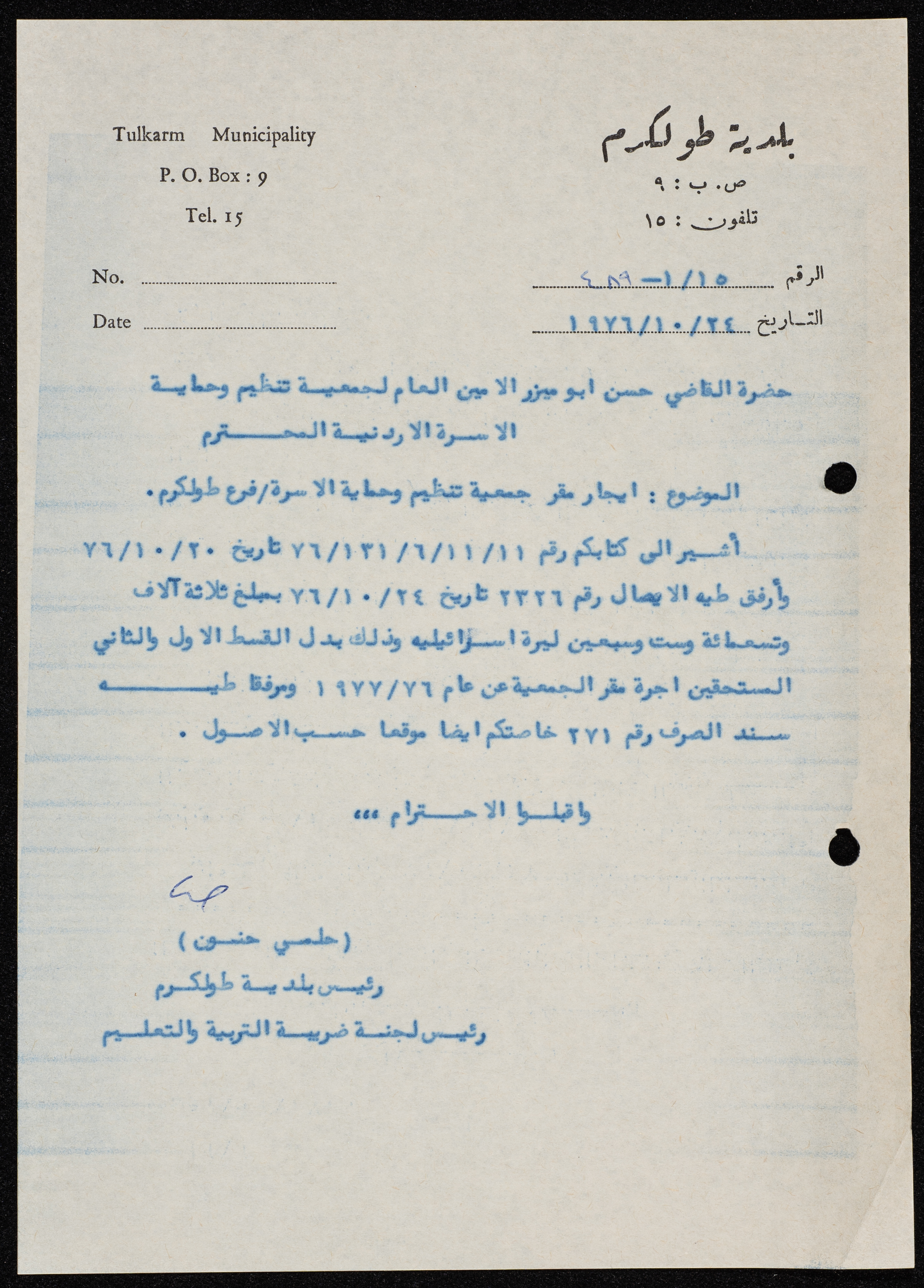 A letter from the mayor of Tulkarm, Hilmy Hannun to Hasan abu-Mizer, secretary-general of the Jordanian Association for Family Planning and Protection, attached with the letter is a receipt of the rent payment from the association for the office they are renting from the education tax committee.