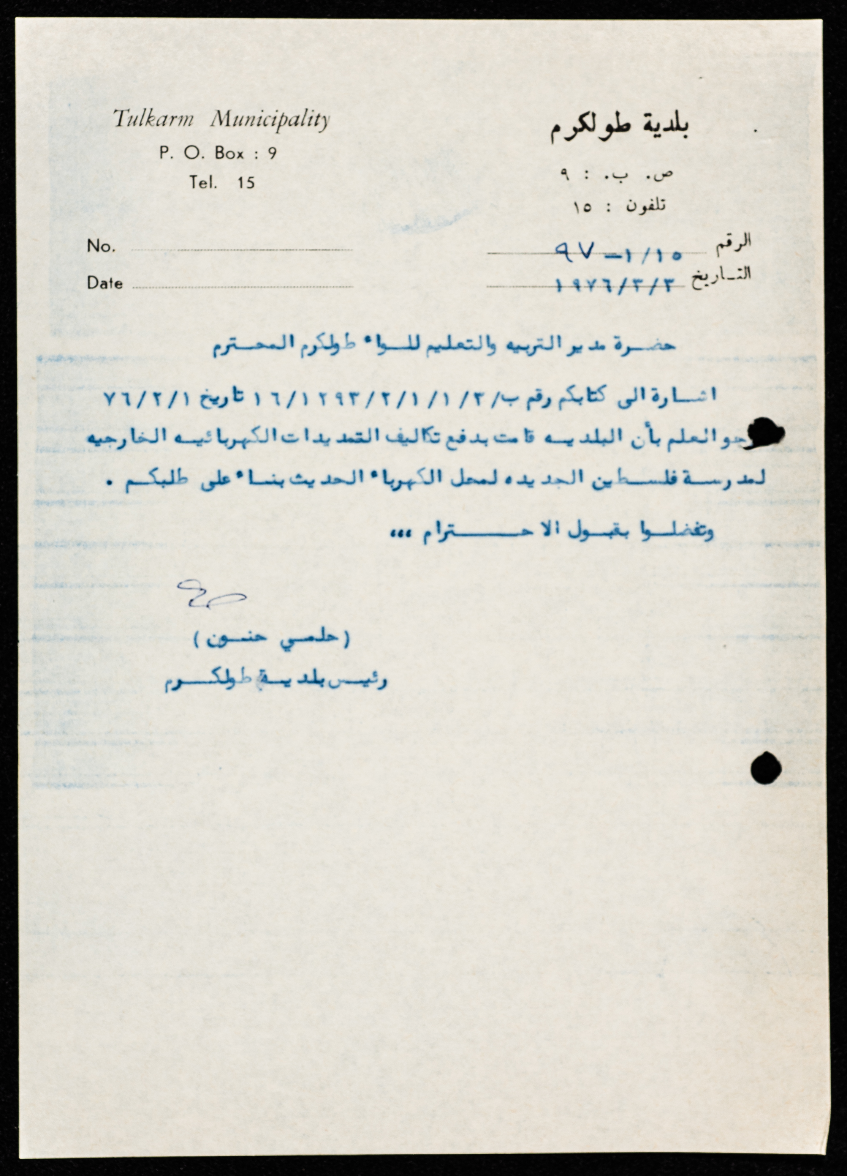 A letter from the mayor of Tulkarm, Hilmy Hannun to the education director in Tulkarm, informing him that the municipality has paid the cost of external electrical wiring to the new school of Palestine.