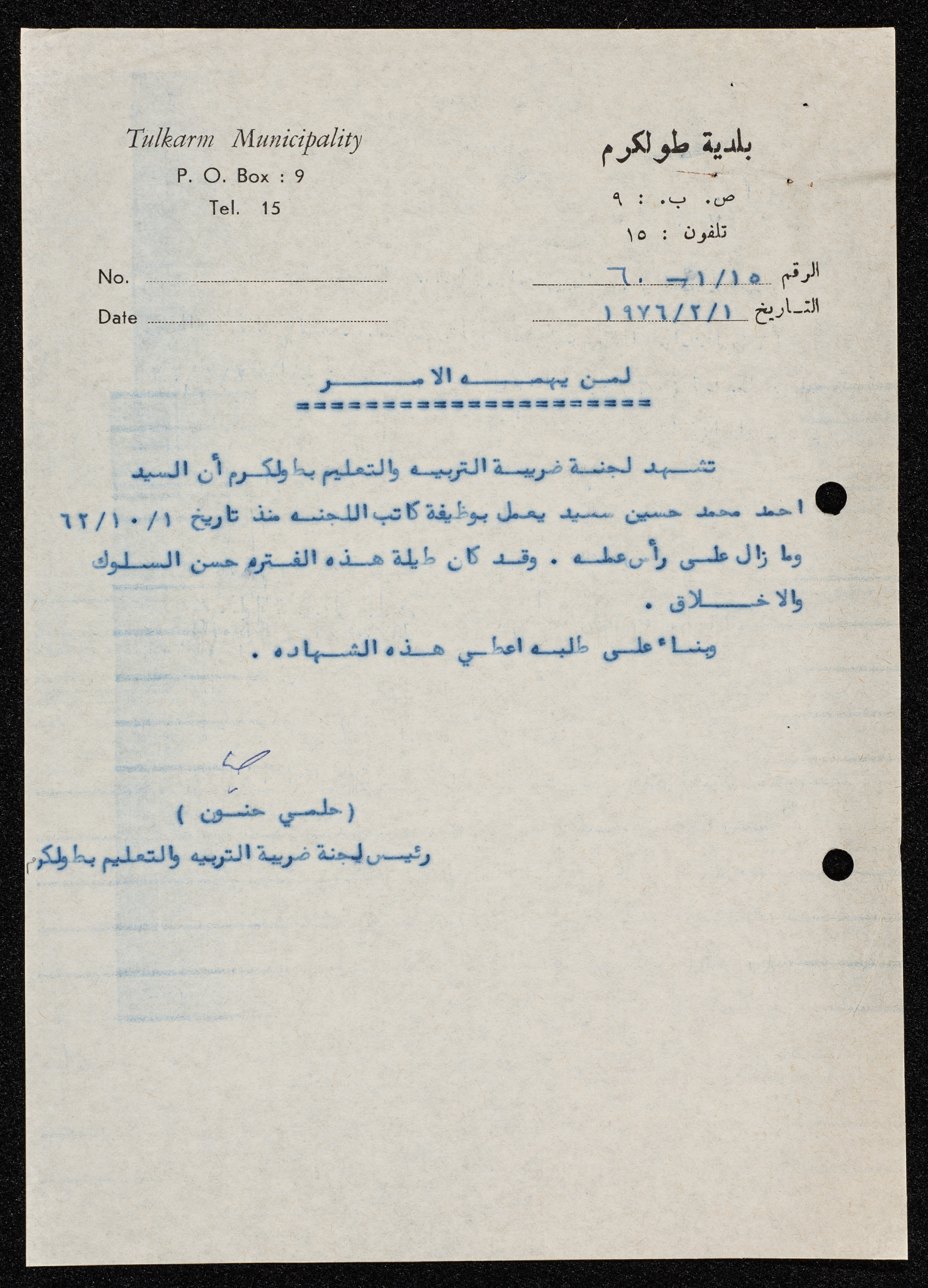 وثيقة مكونة من صفحة واحدة صادرة عن رئيس لجنة ضريبة التربية والتعليم، فيها شهادة بأن أحمد سيد موظف مع لجنة ضريبة التربية والتعليم، ويشغل وظيفة كاتب للجنة.