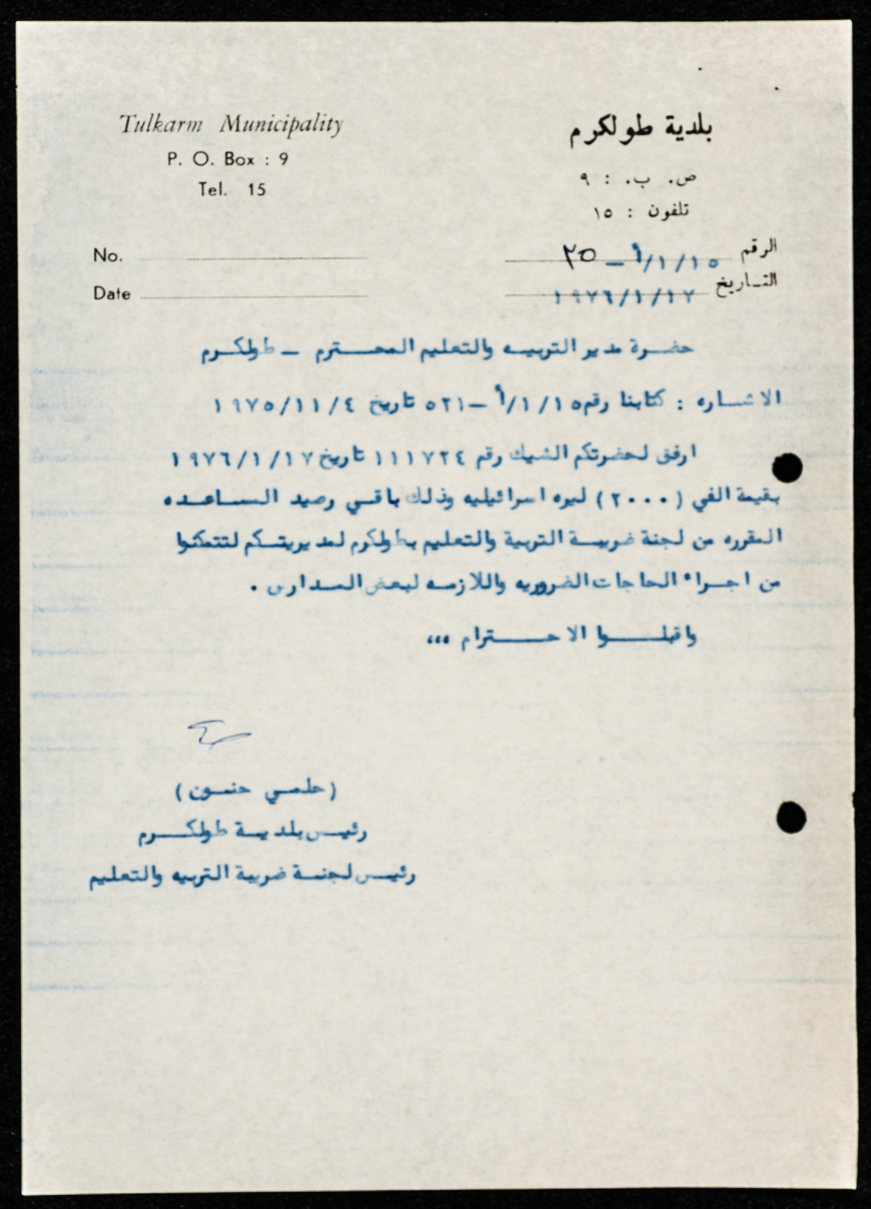 كتاب موجه من رئيس بلدية طولكرم إلى مدير التربية والتعليم بطولكرم
