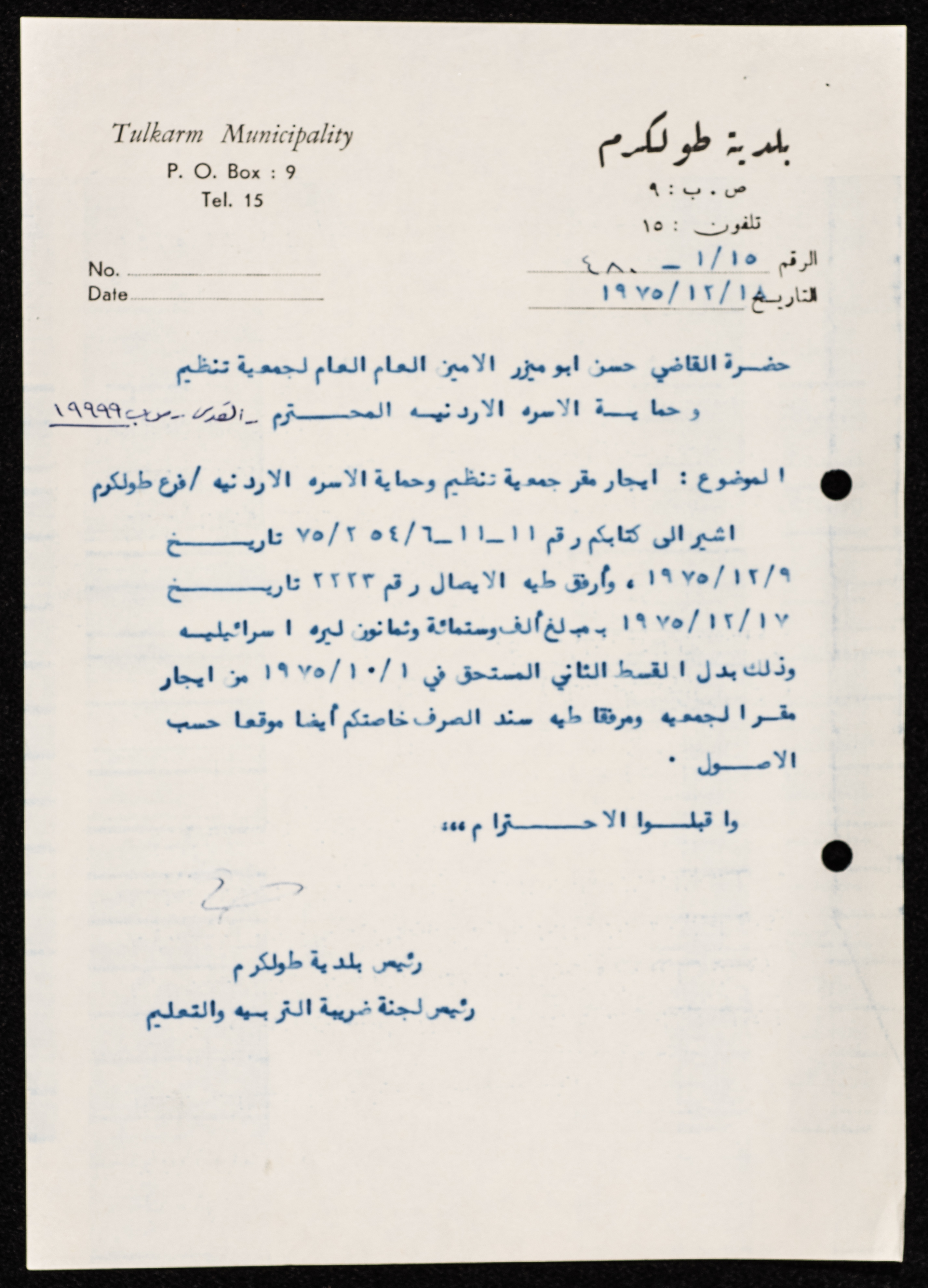 Ozrail, Samar, "The Tulkarm Municipality Collection", archival collection, 20 January – February 2019, the Palestinian Museum Digital Archive.
