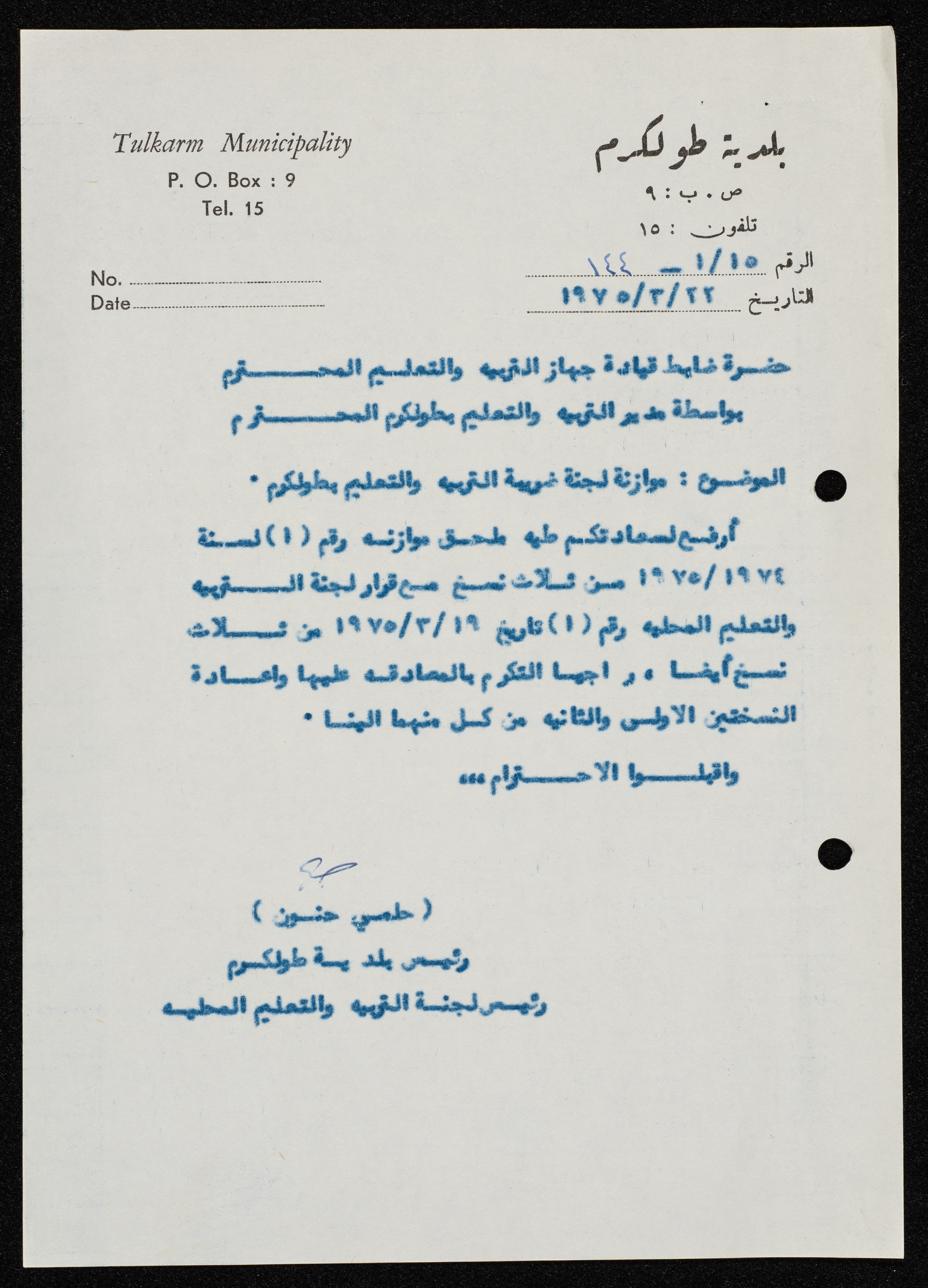 A letter from the mayor of Tulkarm, Hilmy Hannun to the education director, he enclosed the budget of the education tax committee for the year 1974/1975.
