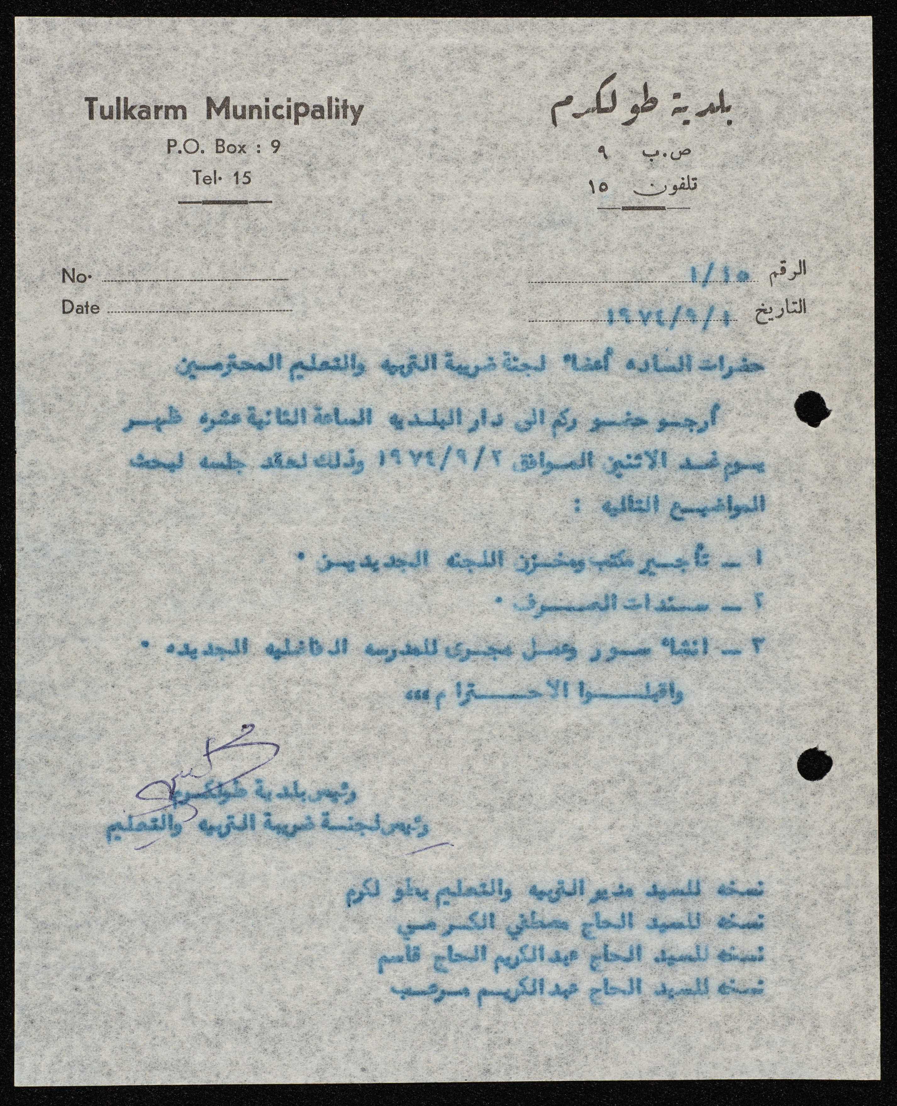 Ozrail, Samar, "The Tulkarm Municipality Collection", archival collection, 20 January – February 2019, the Palestinian Museum Digital Archive.