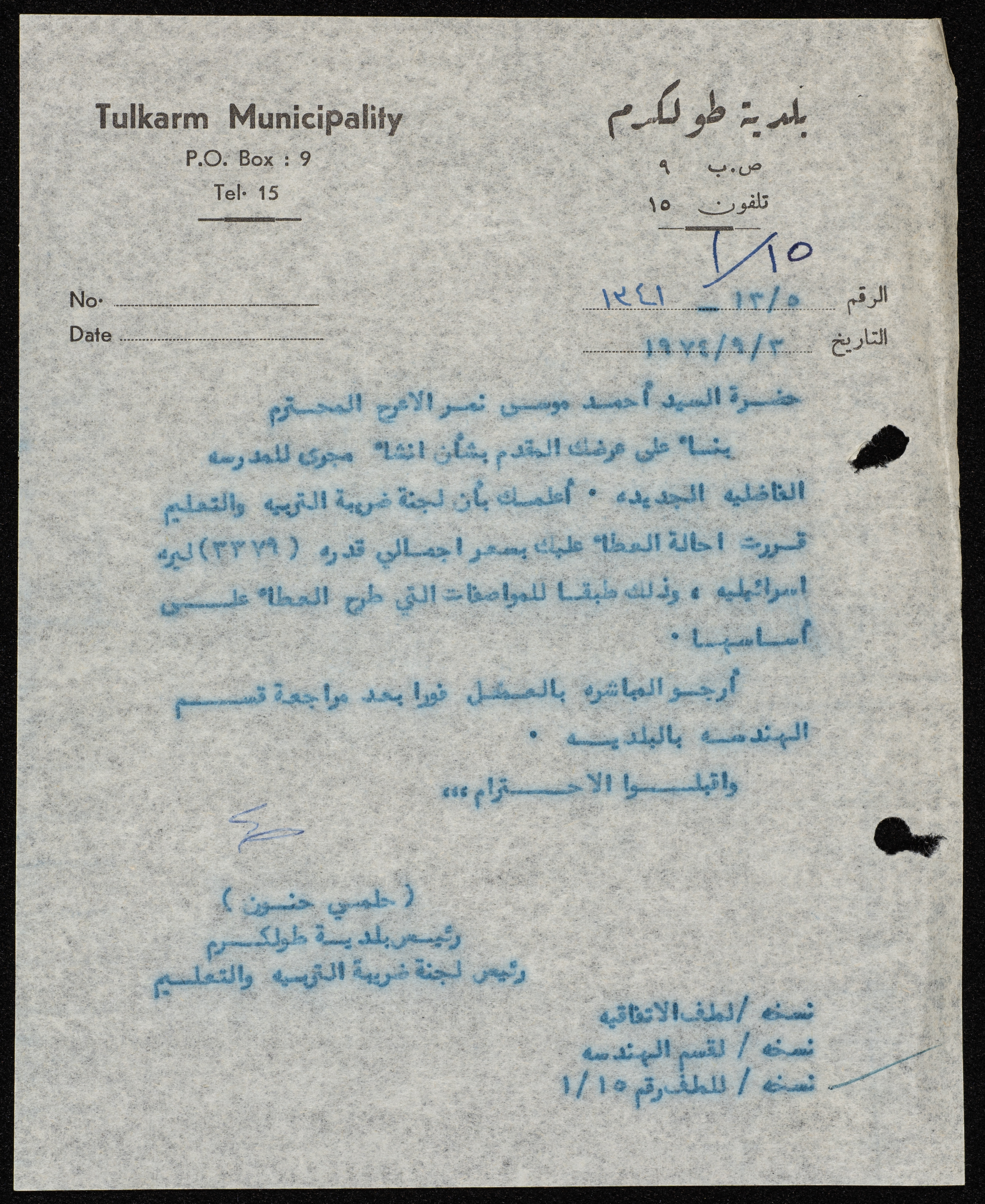 Ozrail, Samar, "The Tulkarm Municipality Collection", archival collection, 20 January – February 2019, the Palestinian Museum Digital Archive.