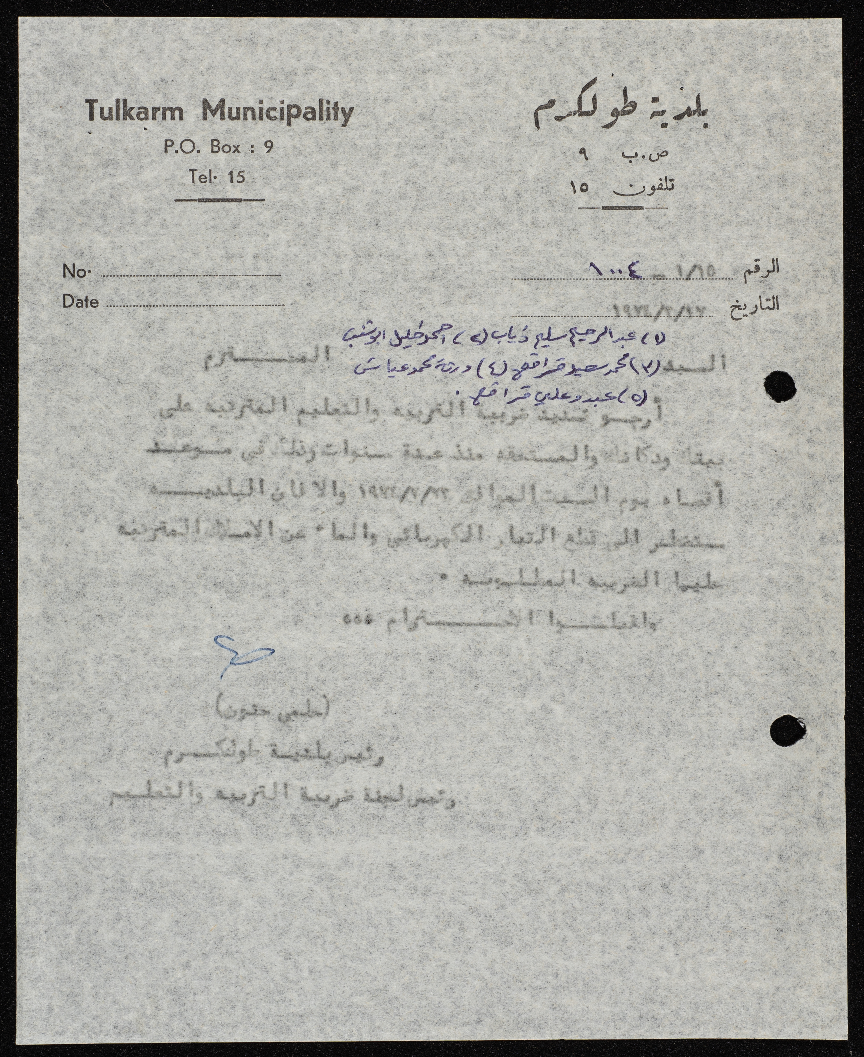 Ozrail, Samar, "The Tulkarm Municipality Collection", archival collection, 20 January – February 2019, the Palestinian Museum Digital Archive.