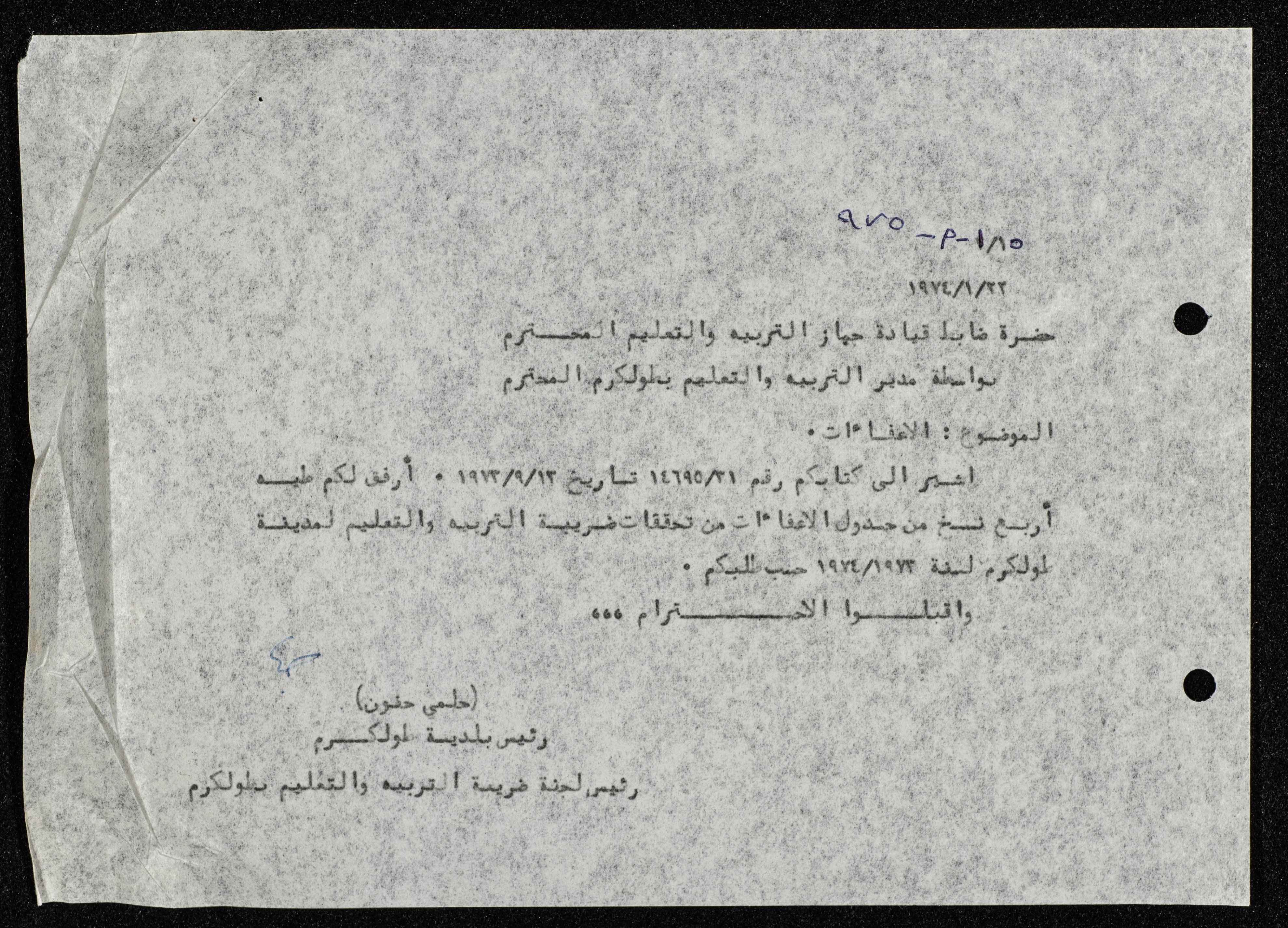 A letter from the mayor of Tulkarm, Hilmy Hannun to the director of the education, attached to the letter is the exemptions approved by the education tax committee.