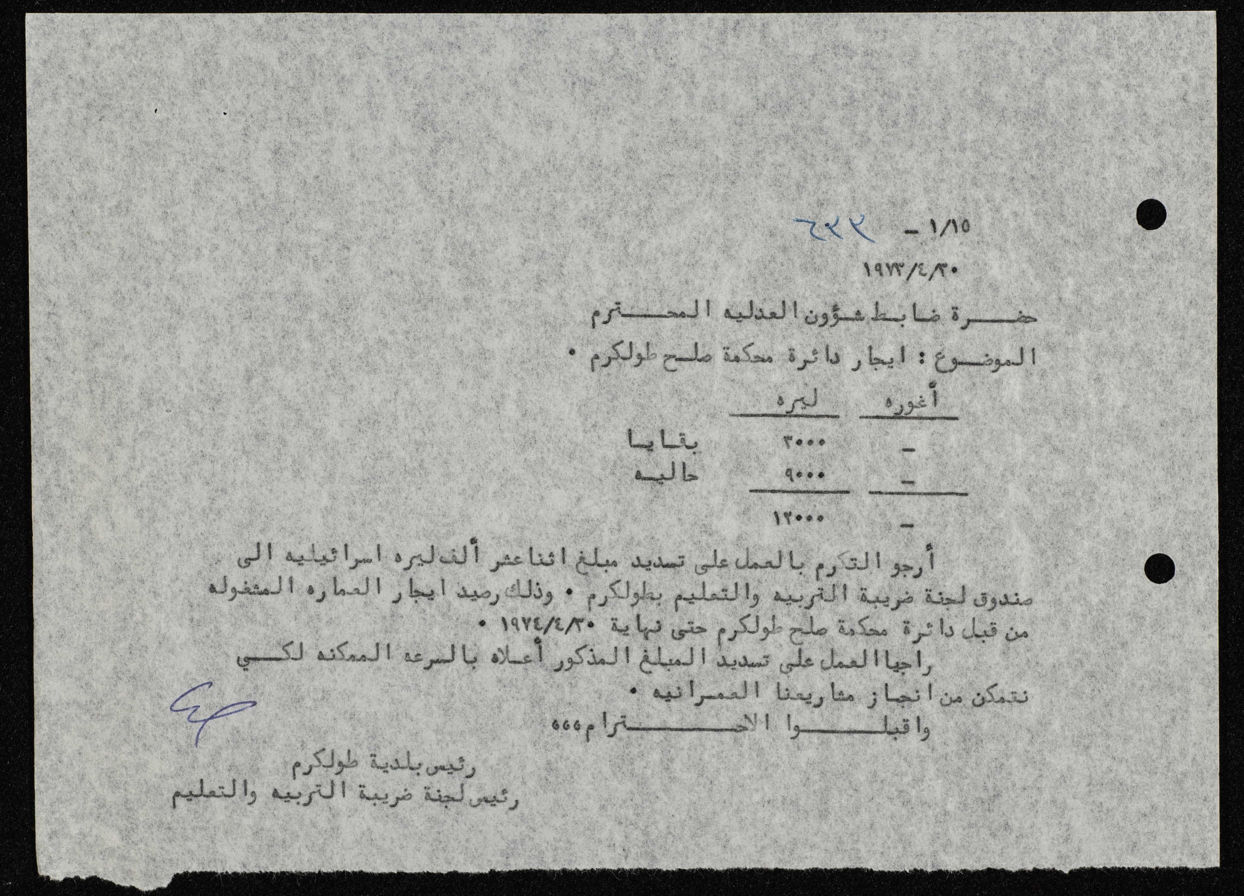 A letter from the mayor of Tulkarm, Hilmy Hannun to the legal affairs officer, the mayor asked him to pay the rent for the offices of the Tulkarm Magistrate Court.