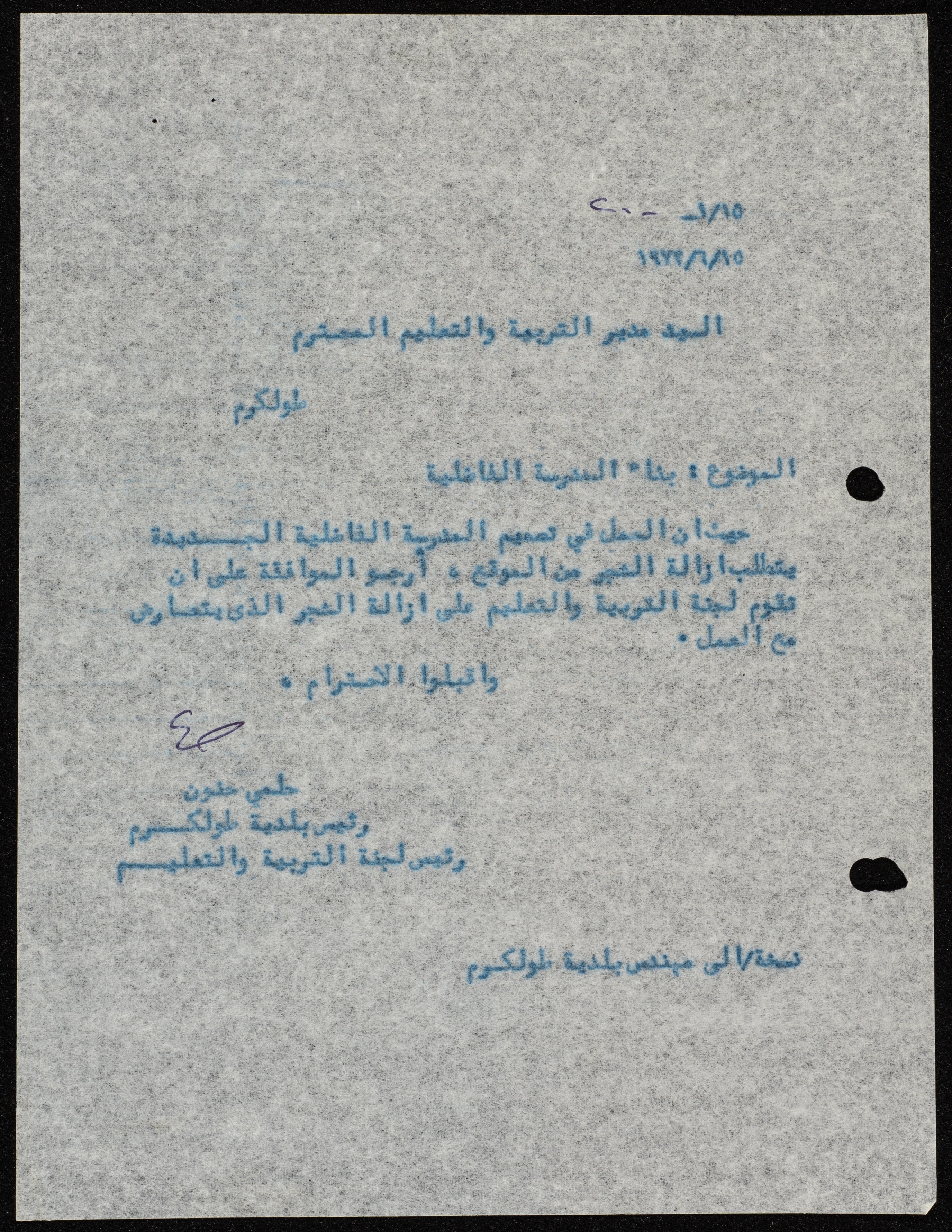 A letter from the mayor of Tulkarm to the education director in Tulkarm, the letter discusses some of the issues related to the building design of the new school.