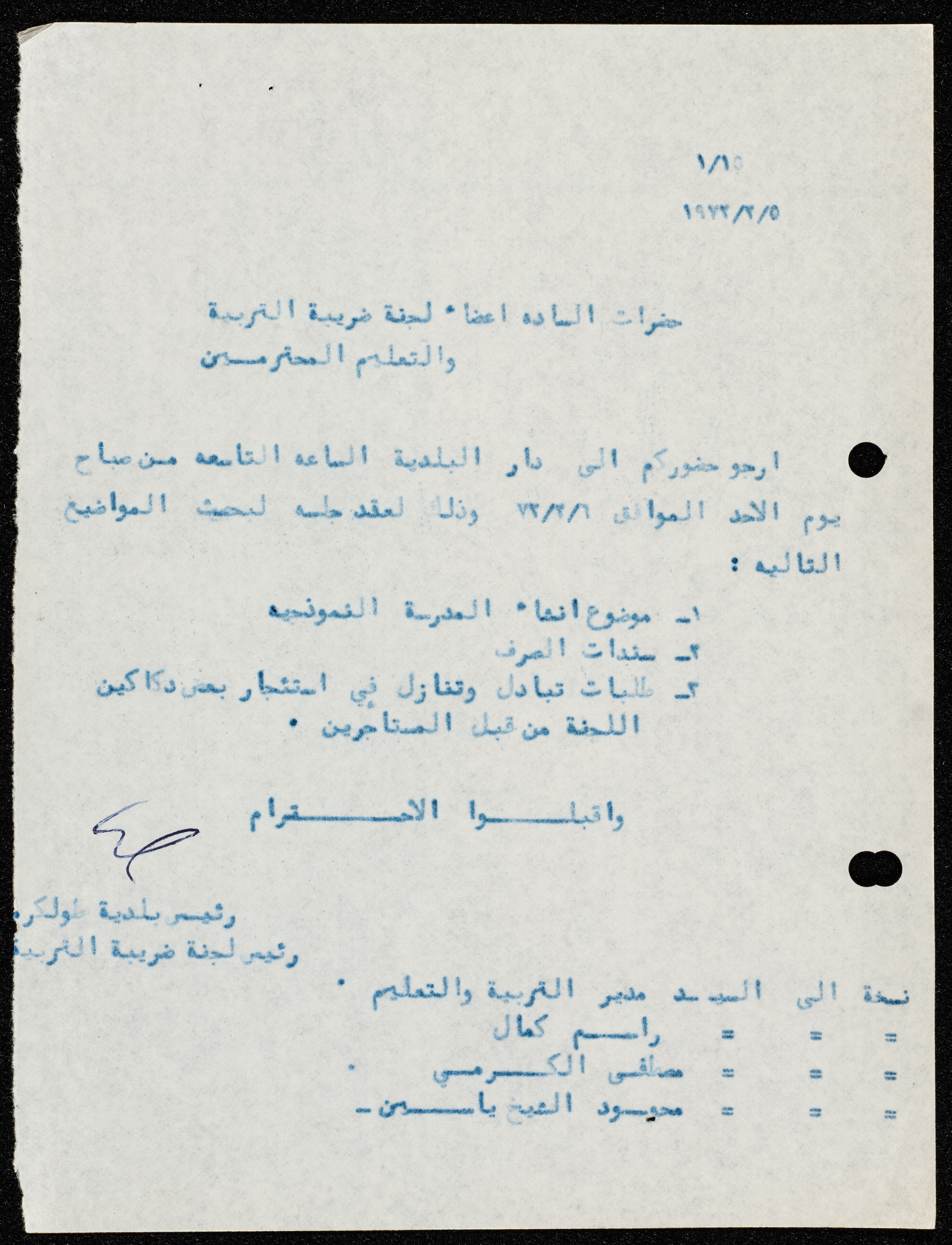 An invitation from the mayor of Tulkarm, Hilmy Hannun to members of the education tax committee, to attend a committee meeting in the municipal building.