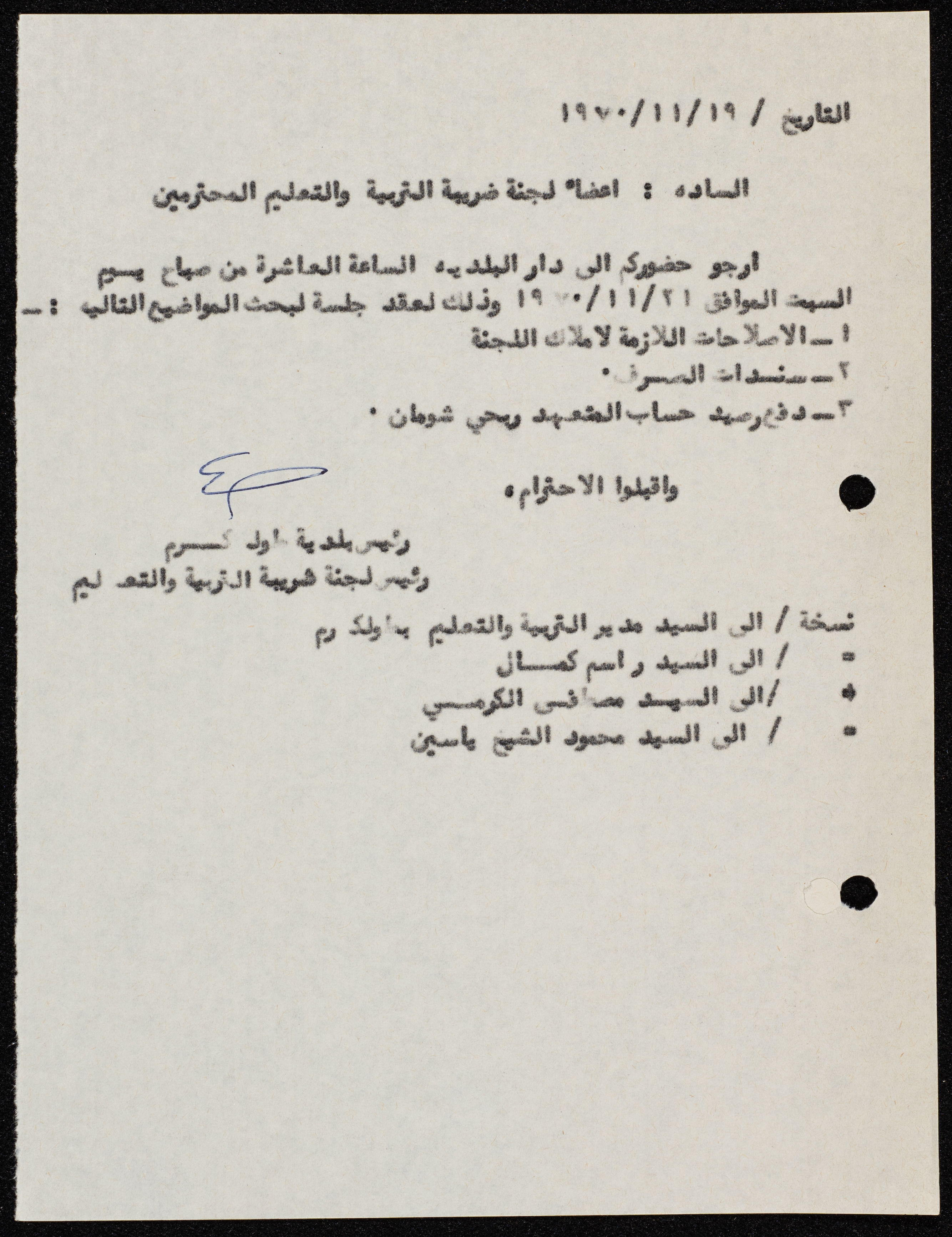 A letter from the mayor of Tulkarm, Hilmy Hannun to the members of the education committee, inviting them to the municipality to discuss some topics.