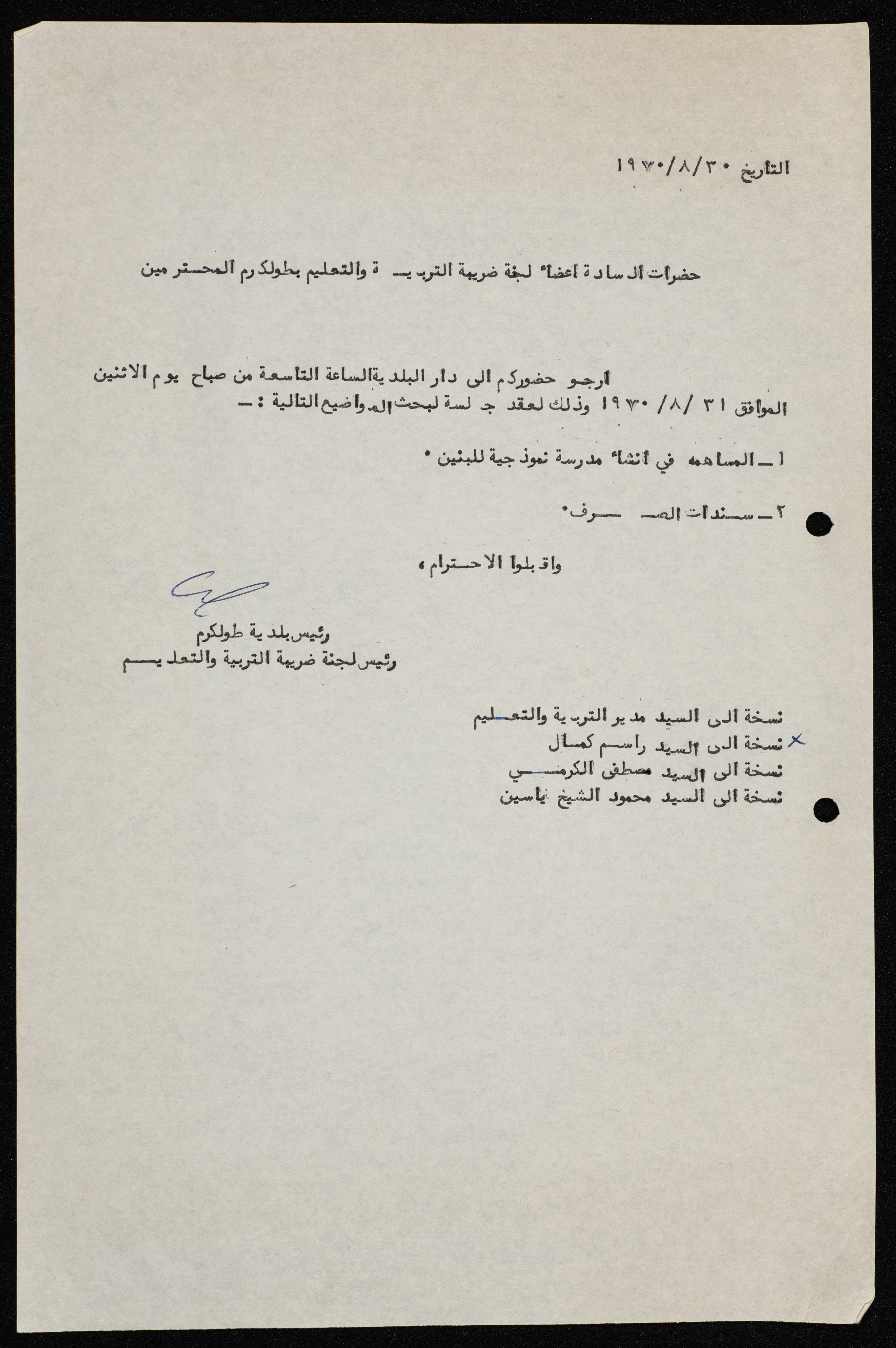 A letter from the mayor of Tulkarm, Hilmy Hannun to the members of the education committee, inviting them to the municipality to discuss some topics.