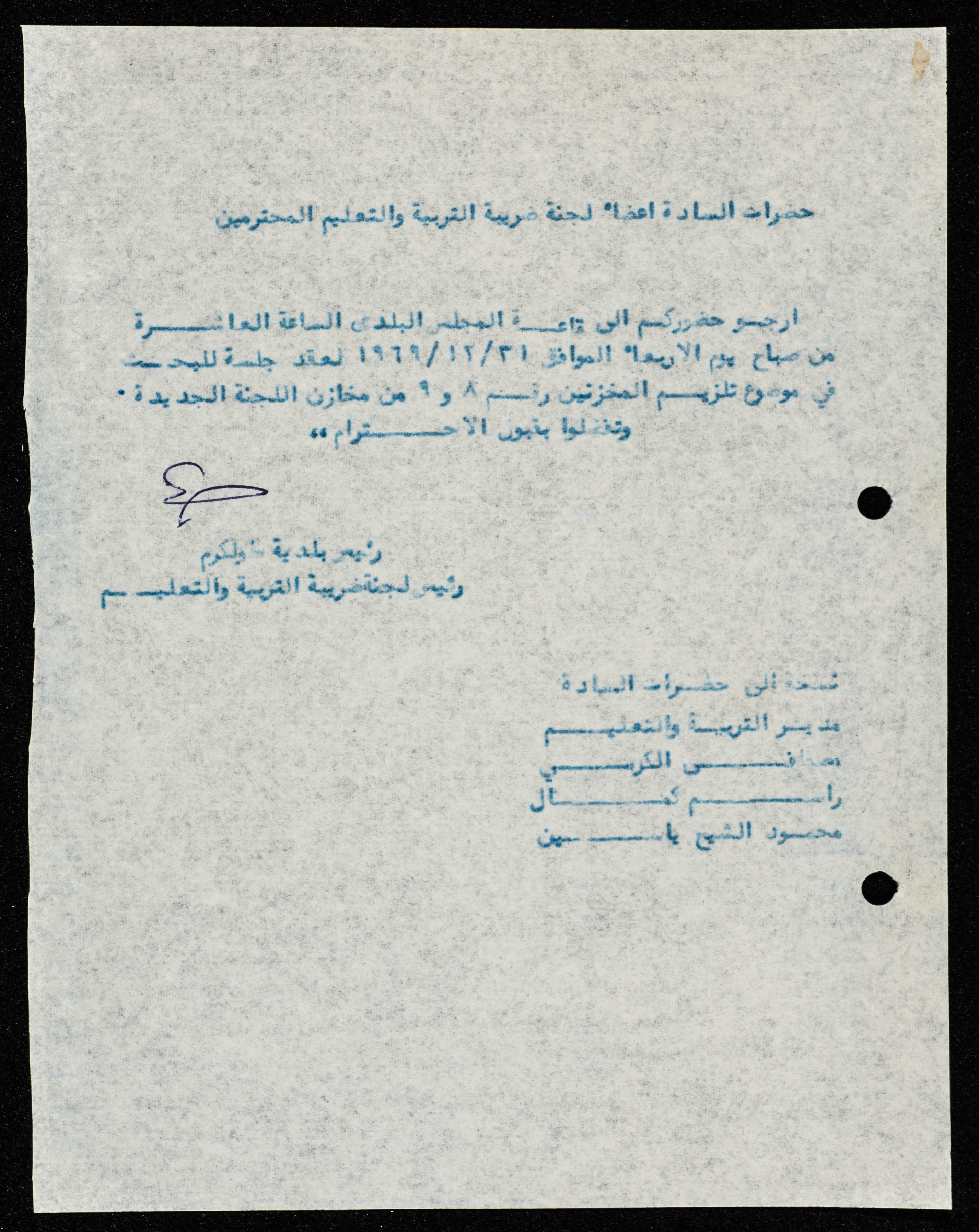 A letter from the mayor of Tulkarm, Hilmy Hannun to the members of the education committee, inviting them to the municipality to hold a session of discussion for the topic of the education tax committee storehouse.